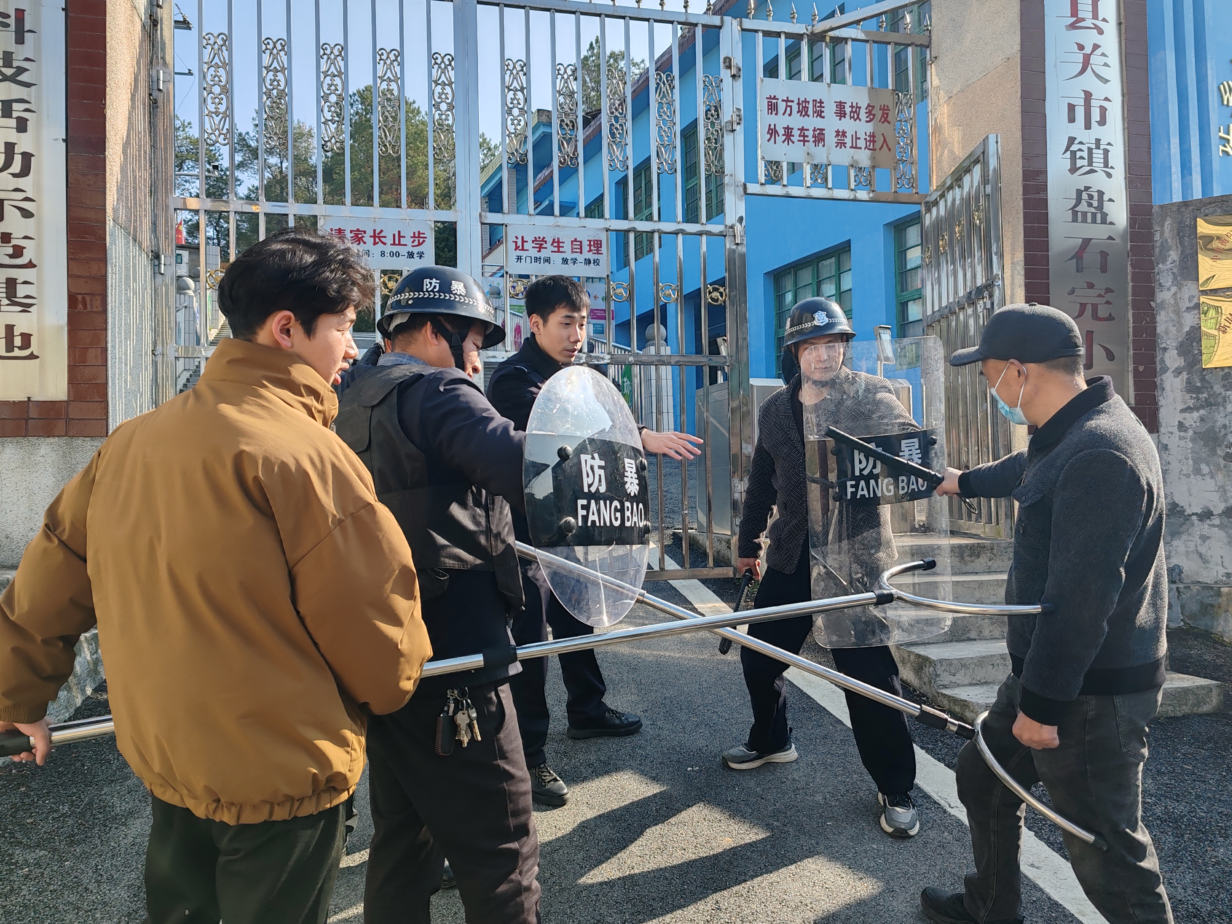 校园防暴演练场景中,一名“暴徒”试图强行闯入校园,学校安保人员立即启动应急预案,按下一键报警装置,手持防暴盾牌、钢叉迅速组成防护阵型,在校门口处与“暴徒”保持安全距离巧妙周旋。派出所民警迅速抵达现场,与安保人员协同作战,运用“格挡、牵制、合围”的实战技巧,成功将“暴徒”制服带离。