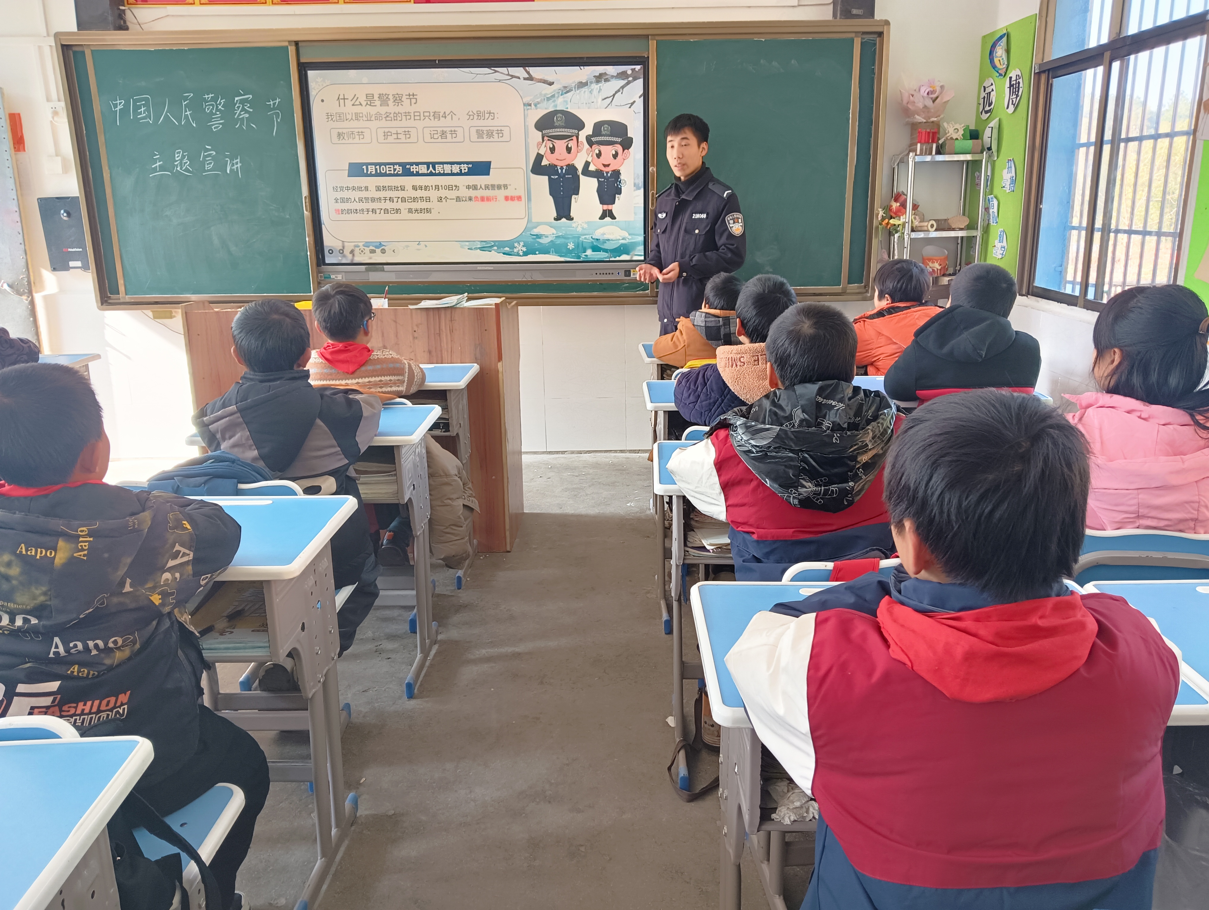 “警徽是中国人民警察的标志和象征,由国徽、盾牌、长城、松枝组成。”派出所民警以警察的职责和义务为切入点,用通俗易懂的语言向师生们阐释了人民警察维护社会治安、打击违法犯罪、保障群众安全的使命。