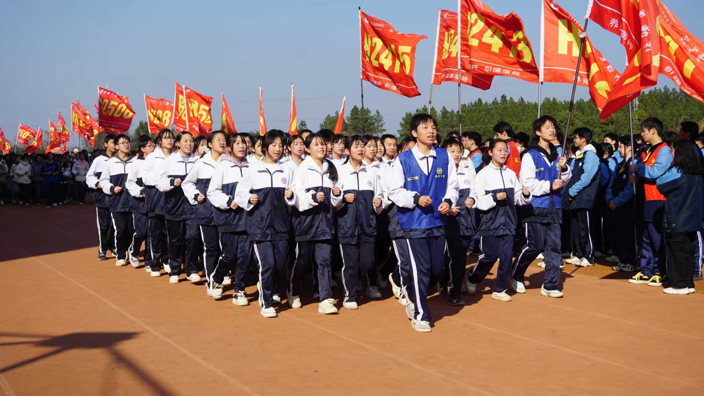 冬日暖阳映照下的田径场气氛热烈,旌旗飘扬。伴随着激昂的运动员进行曲,比赛正式拉开序幕。各班方阵依次有序入场,同学们身着统一校服,精神抖擞,意气风发。