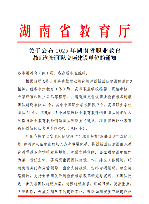 湖南教育新闻网讯(通讯员 李燕)近日,湖南省教育厅发布《关于公布2025年湖南省职业教育教师创新团队立项建设单位的通知》《关于公布首批“湖南省高校黄大年式教师团队”名单的通知》,湖南工程职业技术学院两支教师团队凭借突出专业优势成功入选。