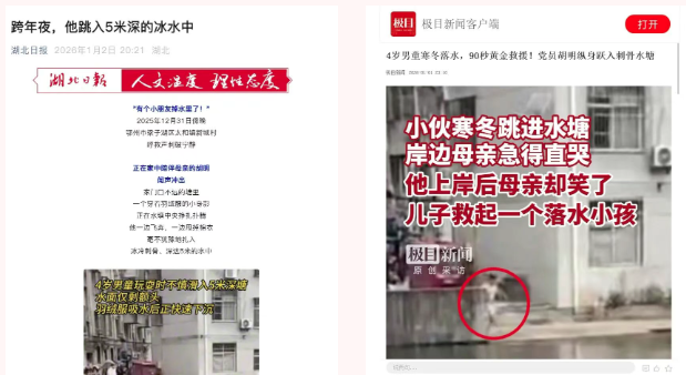 2025年12月31日,在湖北省太和镇某村,一名4岁半男童不慎坠入5米深的冰冷水塘,危急时刻,回乡陪伴生病母亲的胡明听闻呼救,毫不犹豫甩掉衣物,一头扎进仅5—6摄氏度的冰水中。他迅速游至男童身旁,抓住孩子脖颈将其头部托出水面,奋力向岸边划行,从听到呼救到成功救起孩子,整个过程仅用两分钟。事后复盘,胡明坦言救援过程暗藏多重危险:水塘最深达8米,冰水刺骨让他上岸后仍在水中缓了1分多钟,男童求生的挣扎也险些将他拖入水底,而其母亲患有心脑血管疾病,受刺激亦有风险,但他始终表示“救人是本能,共产党员更应冲锋在前”。