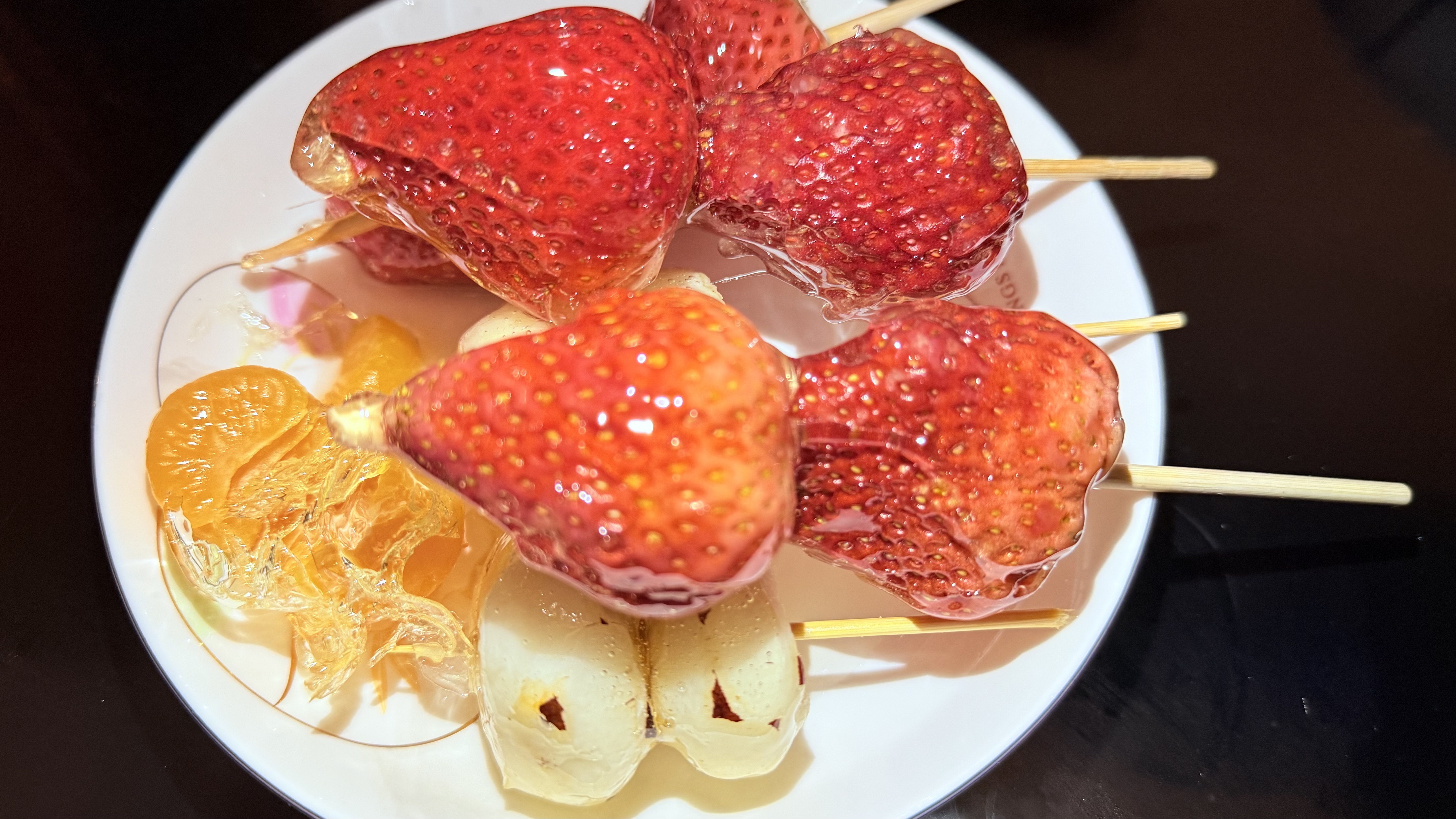 裹糖是最后的点睛之笔,拿起果串快速裹上一层薄糖,立刻放入冷水中定型。不过片刻,晶莹的糖衣便凝固成型,包裹着新鲜的水果,颜值十足。咬下一口,糖壳咔嚓作响,酥脆香甜,内里的水果鲜嫩多汁,酸甜交融。只是糖衣稍稍黏牙,这小小的不完美,反倒成了独属于我们的年味印记。