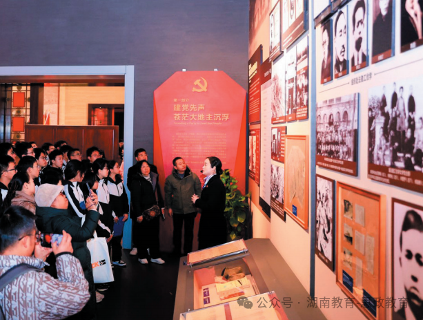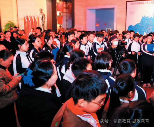 政治教师在校园内青年毛泽东《商鞅徙木立信论》的石刻前,讲述法治思想的萌芽;历史教师带领学生在中共长沙历史馆的毛泽东故居现场,感受革命者的抉择与担当;语文教师在毛泽东诗词碑廊前,豪迈朗诵《沁园春·长沙》,解析文字背后的雄心壮志;师生在伟人铜像下,共同唱响一首激昂的红色歌曲。知识、情感、信念,在行走与体验中被打通、被激活。