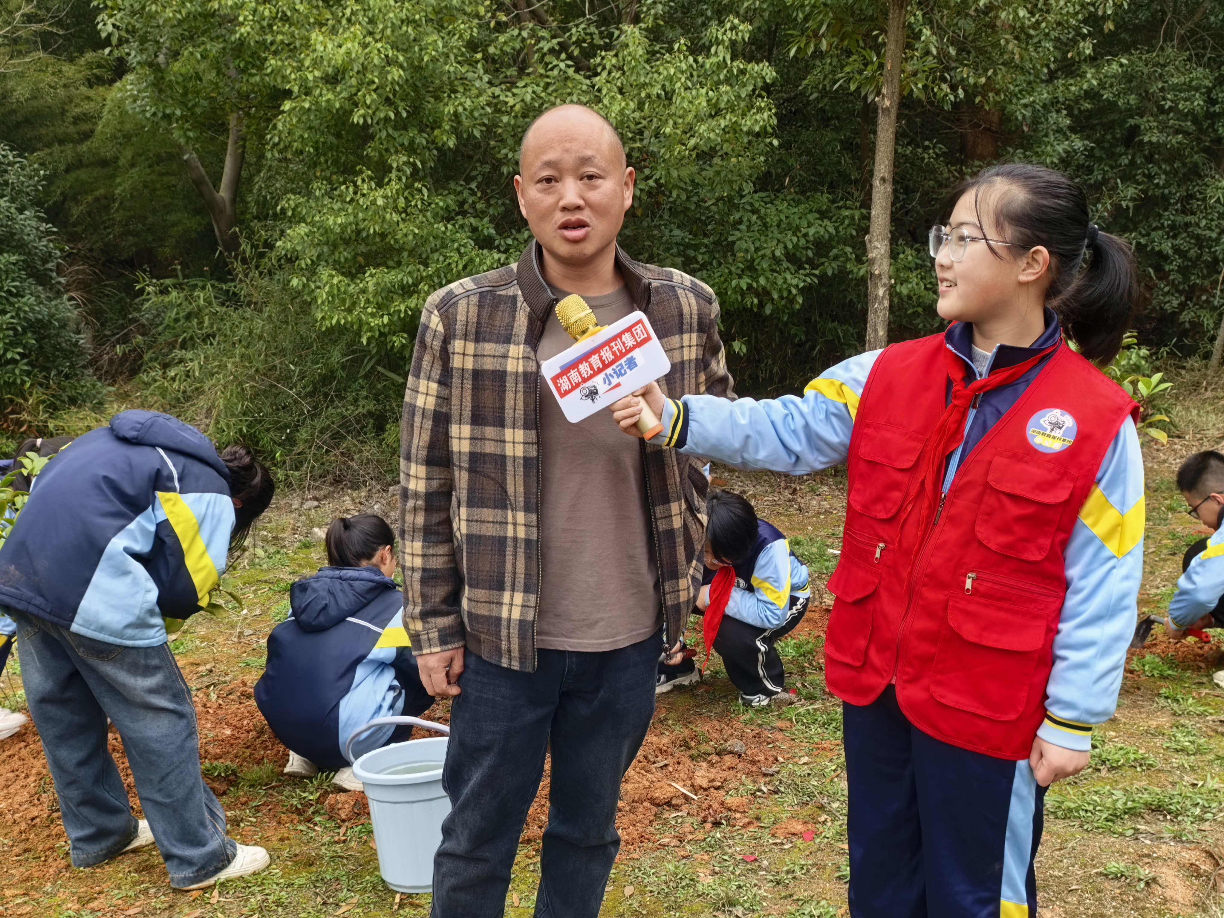 考虑到许多同学是第一次参加植树活动,小记者向彭部长提问:“很多同学都是第一次参与植树,想请教您有哪些实用技巧,能让我们今天种下的小树苗成活率更高、生长得更快呢?”彭部长耐心地为同学们分享了三个关键技巧:“第一是种树时要遵循‘三埋两踩一提苗’的原则,即分三次填土、两次踩实土壤,最后轻轻提动树苗以舒展根系;第二是种植完成后要浇透‘定根水’,确保土壤与根系紧密贴合;第三是后期若遇天气干旱,需定期补水,也可适当为树苗松土,这样小树苗就能茁壮成长了。”