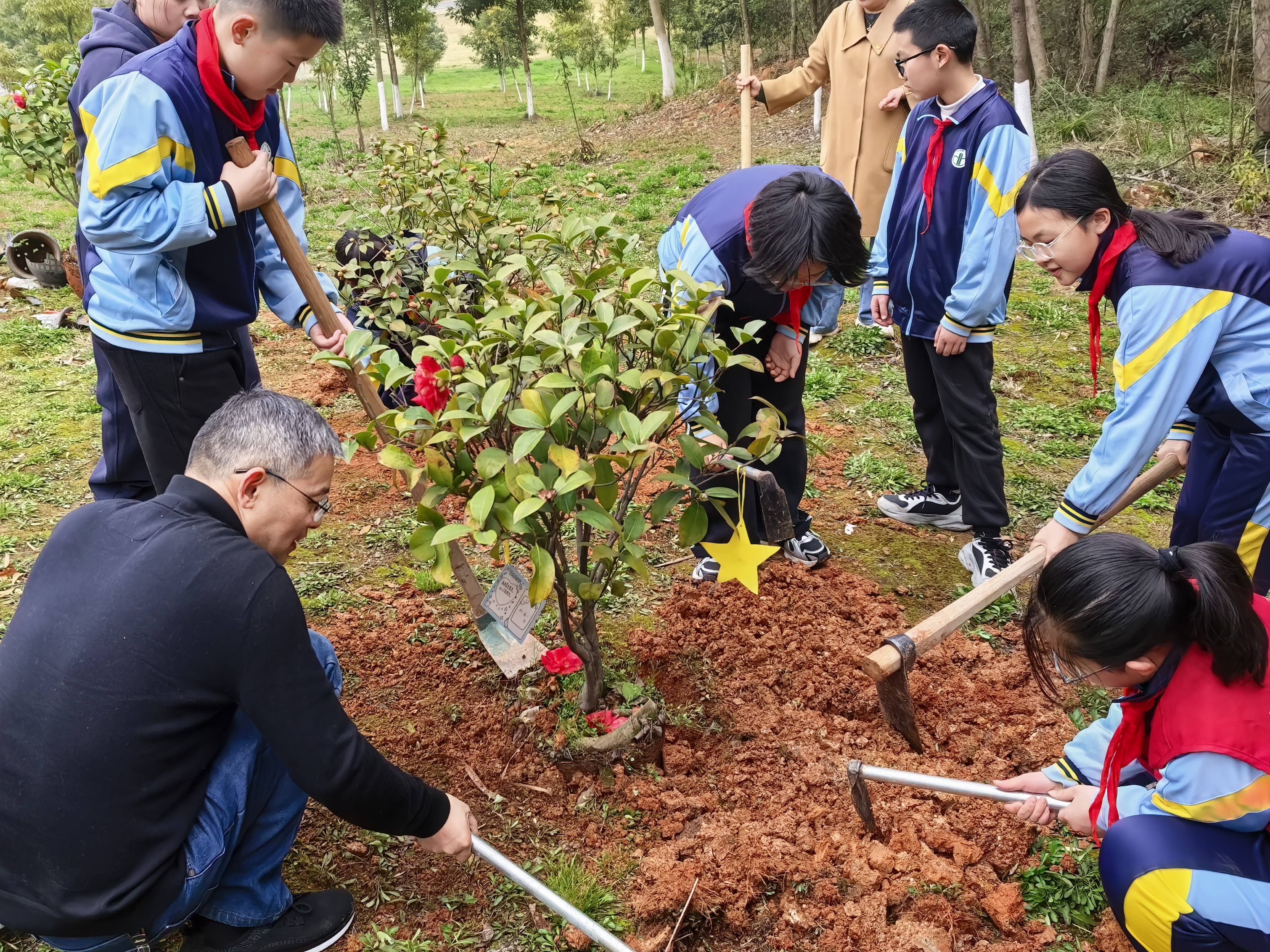 春回大地,万物复苏,植树基地一片热火朝天的劳动景象。活动伊始,学校党支部副书记后浪向队员们讲解了植树节的由来和意义,介绍了本次种植的山茶树的生长习性和生态价值,同时寄语少先队员要像小树苗一样扎根土壤、向阳生长,努力成长为能够担当民族复兴大任的时代新人。