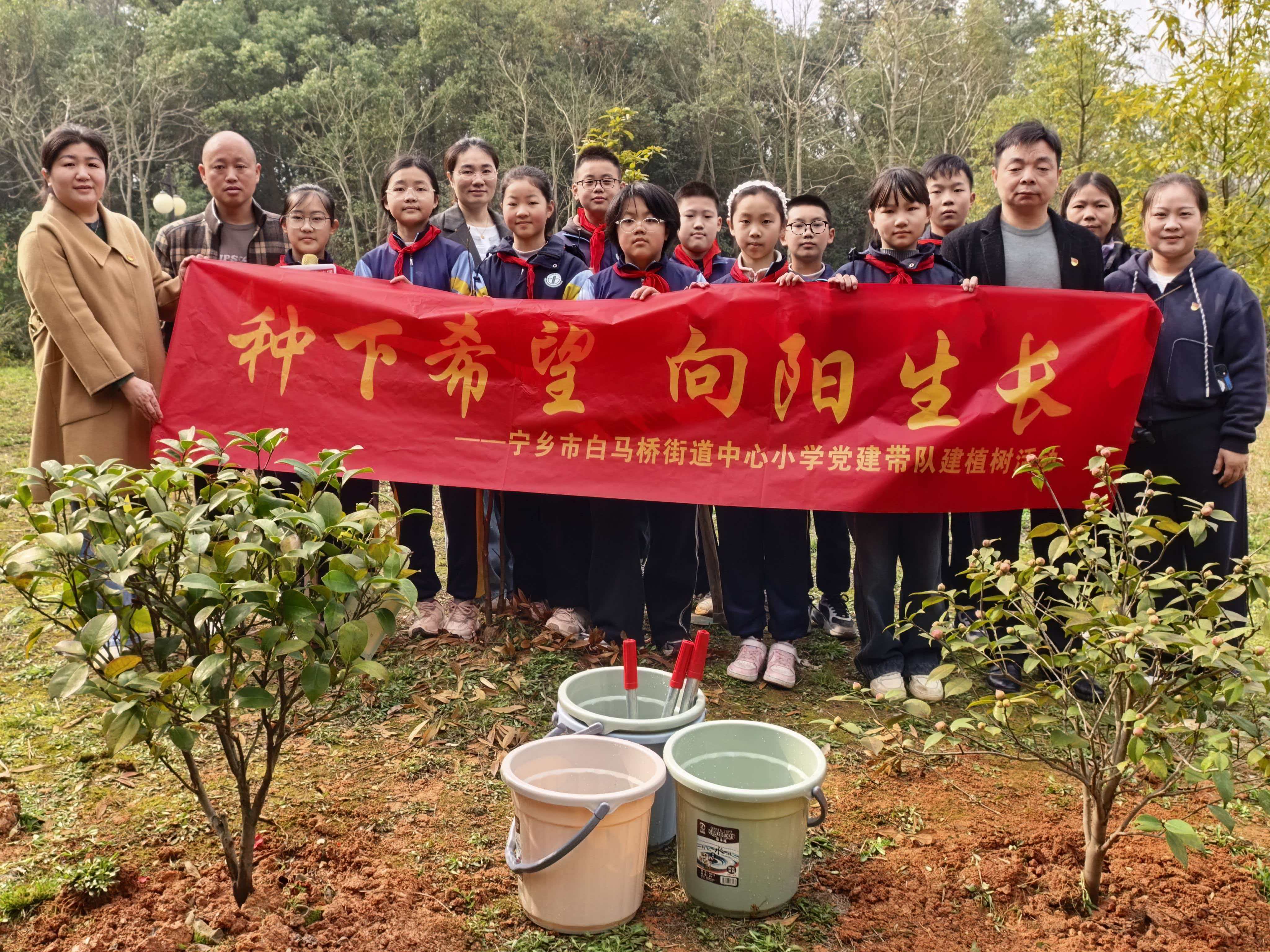 湖南教育报刊集团宁乡市小记者站(小记者 何恬宇)3月12日,白马桥街道中心小学六年级少先队员代表与学校党员教师代表一同走进宁乡市玉潭公园义务植树基地,开展“种下希望,向阳生长”主题植树活动。本次活动以党建为引领,充分发挥党员教师的先锋模范作用,带动少先队员在劳动实践中厚植生态文明理念,传承“植绿、护绿、爱绿”的优良传统。
