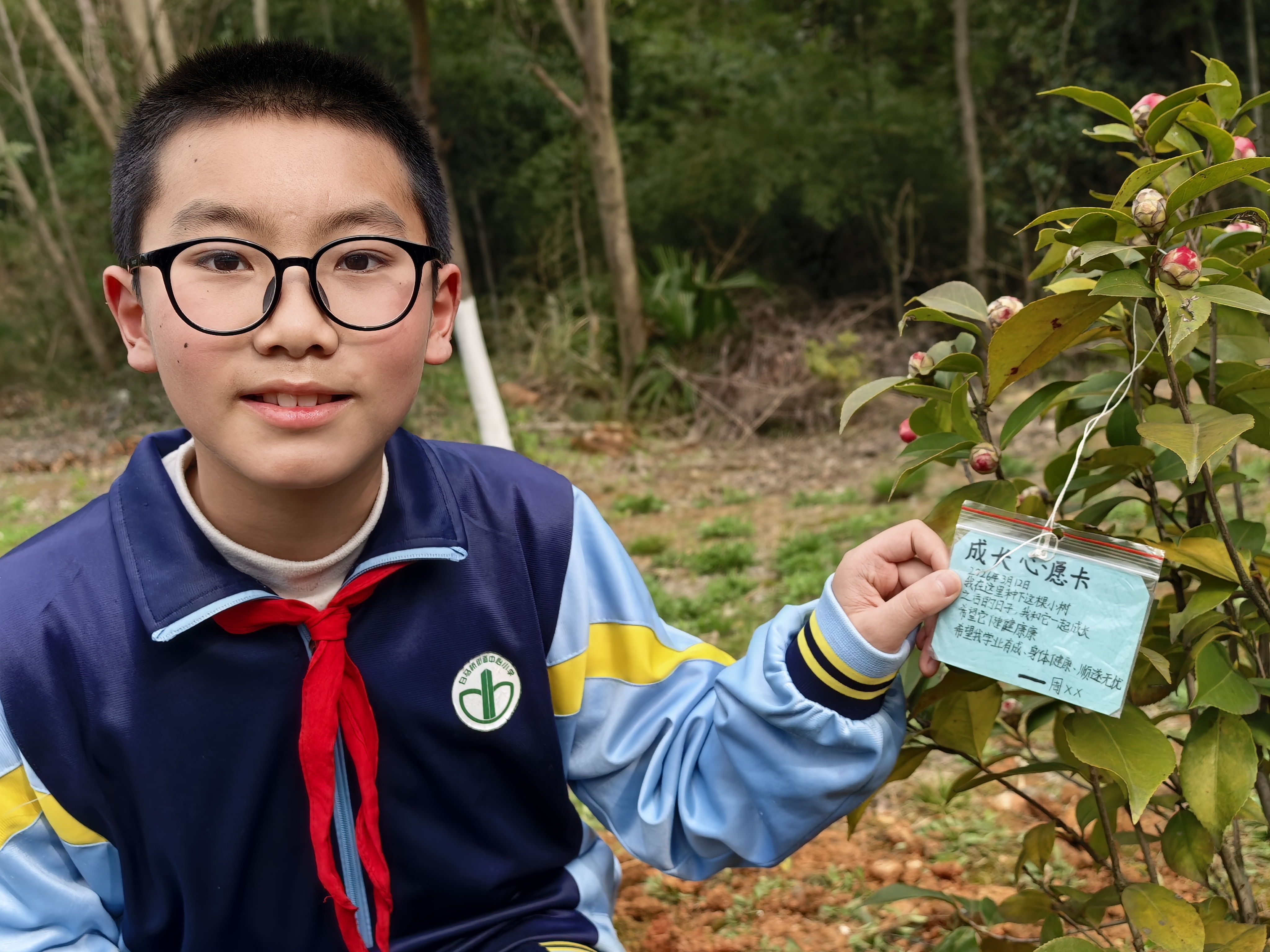 经过一个多小时的辛勤劳作,山茶树树苗在山坡上错落有致、迎风挺立,为春日的玉潭公园增添了勃勃生机。劳动结束后,队员们纷纷将自己亲手制作的“成长心愿卡”挂在树苗上,卡片上写满了对小树苗的祝福和对未来的期许:“希望我和小树一起茁壮成长”“愿绿水青山永远伴随我们”……小小的卡片承载着队员们的绿色梦想,也让这片“党建带队建希望林”有了特殊的意义。