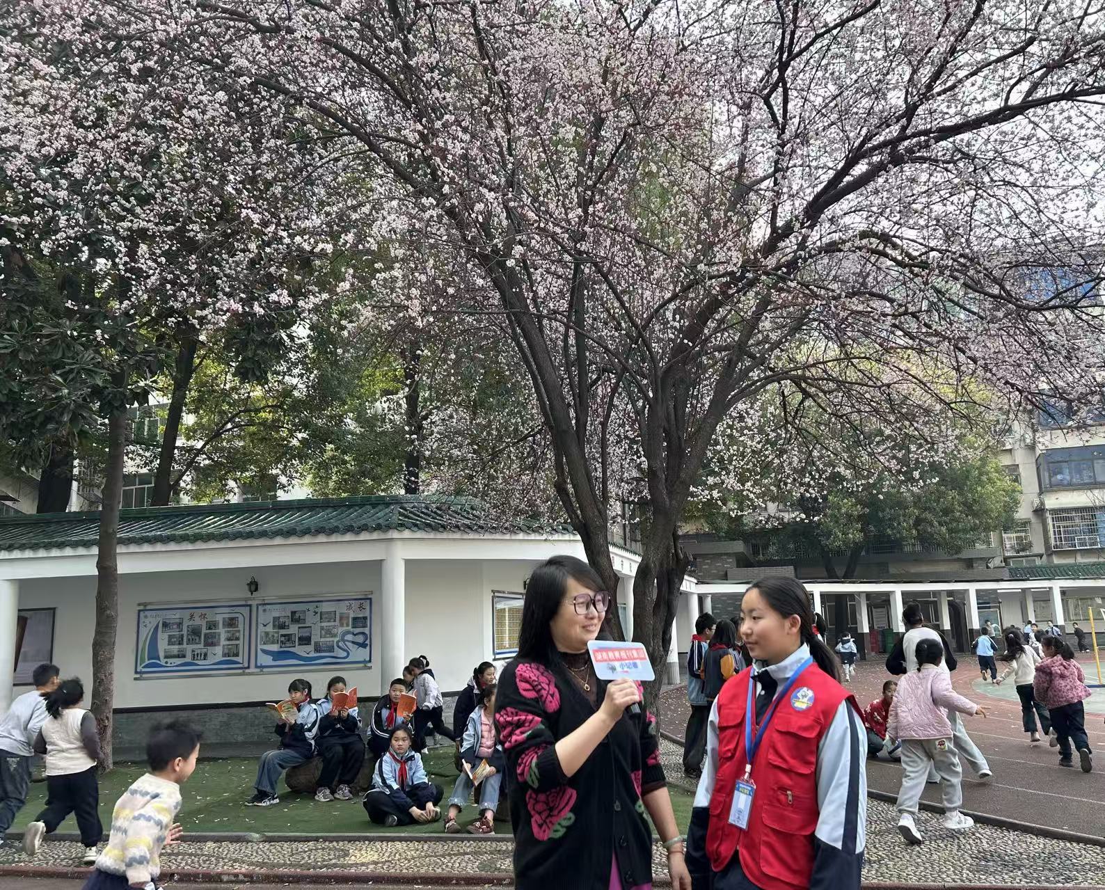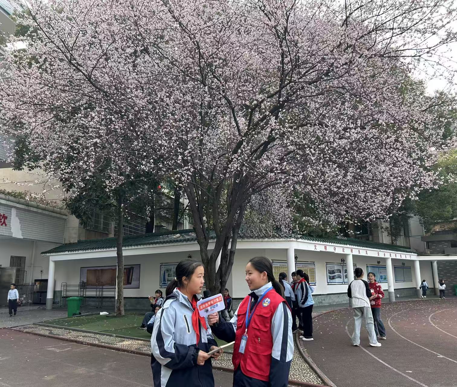 课间时分,操场旁的红叶李树成为全校焦点。遒劲的紫褐色枝干舒展向上,粉白小花密密匝匝缀满枝头,紫红叶片与花瓣相映成趣。不少师生围聚树下,大家或捡拾飘落的花瓣,或在树下游戏,或轻声交流着赏花的喜悦,或在树下阅读,清脆的笑声回荡在校园上空,让春日校园更显鲜活热闹。