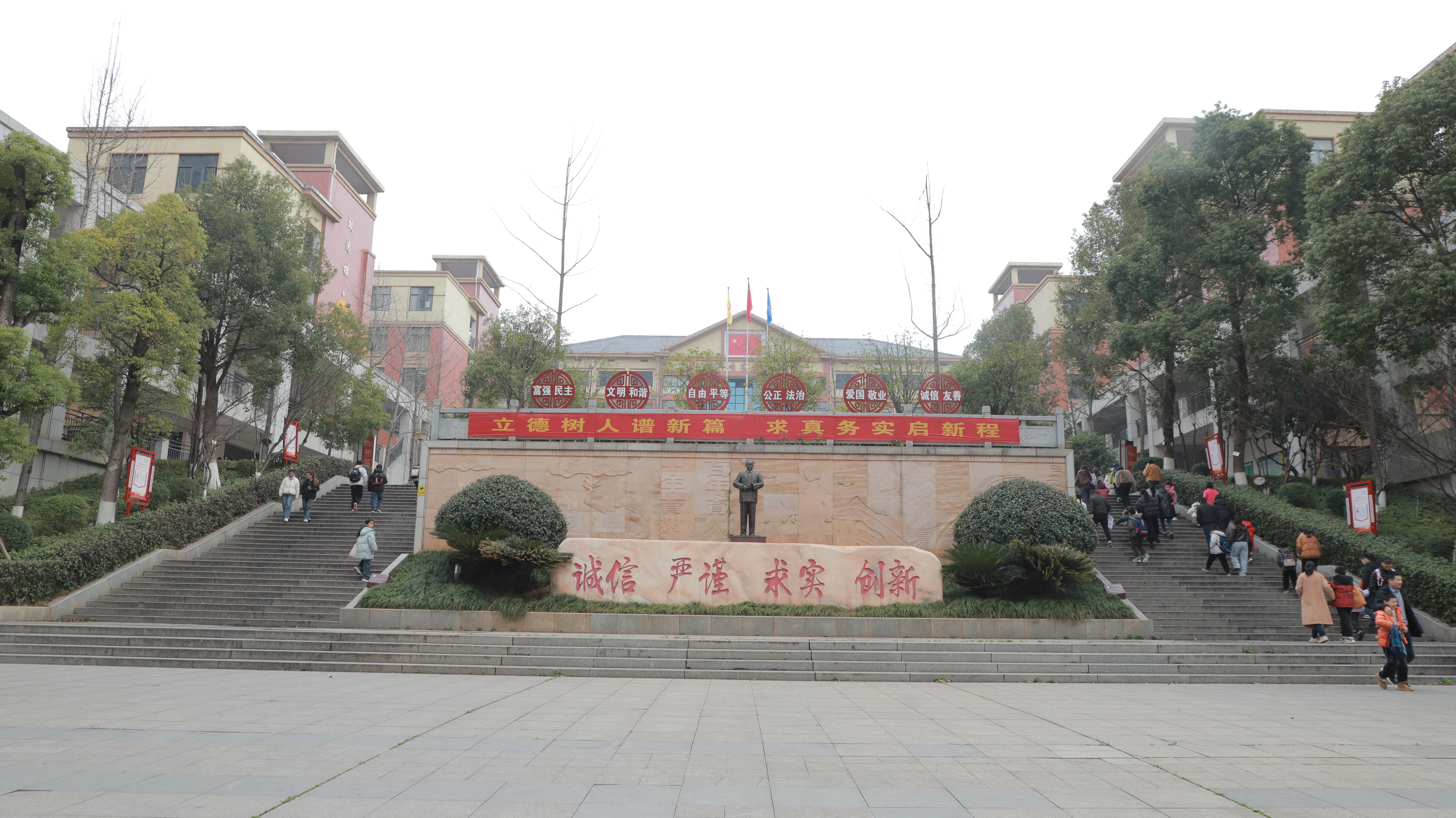 清晨,校门口便迎来报到高峰,安保人员与值班教师分工值守,耐心引导入校流程。身着整洁校服的同学们背着书包,踏着春光步入校园,一声声清脆的“新年好!”“老师好!”为校园增添了浓浓暖意。