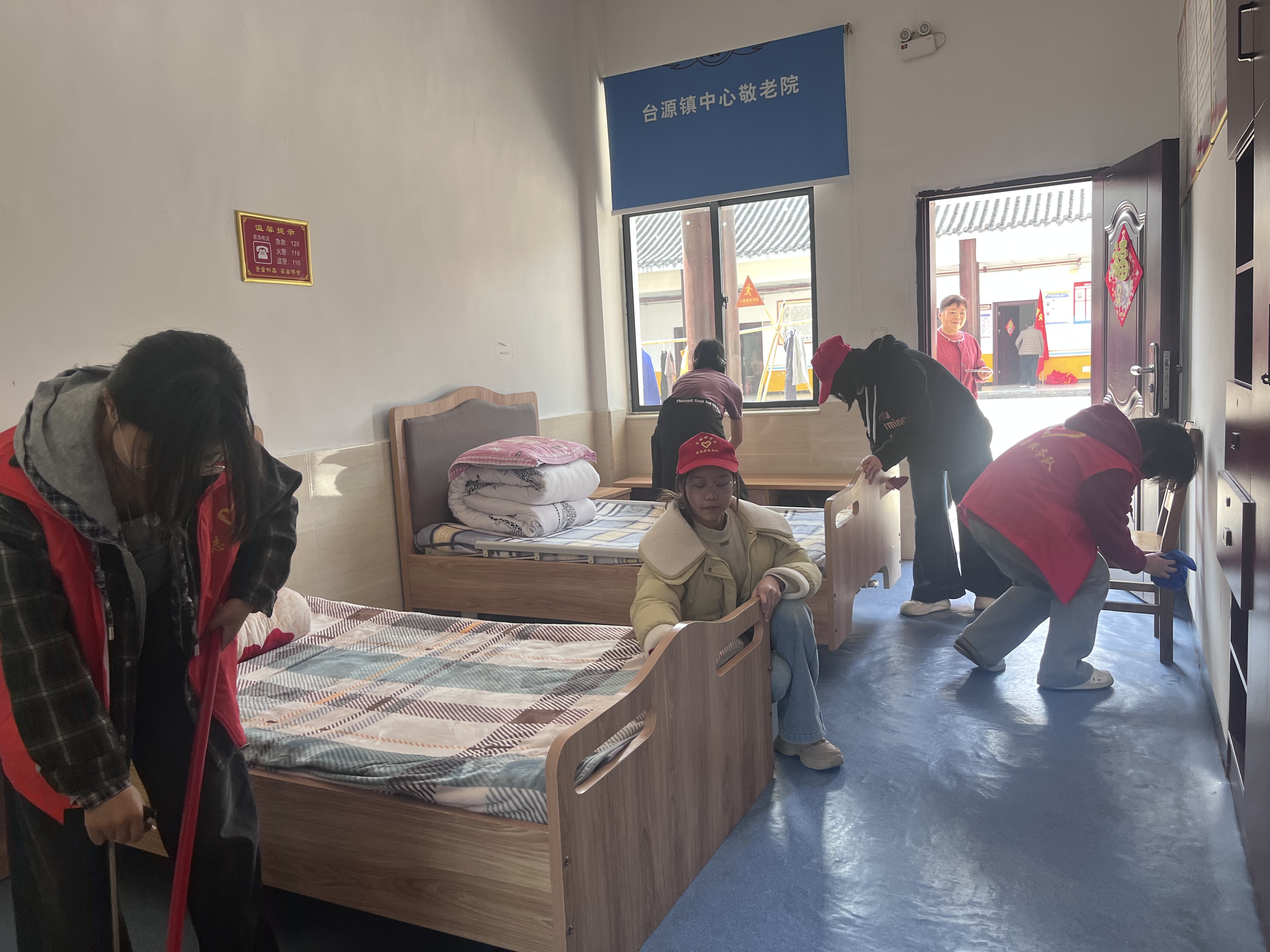 在老师的组织下,志愿者们分工协作:有的认真清扫庭院、擦拭门窗桌椅、整理老人床铺,细致清理每一处卫生死角;有的陪伴老人唠家常、话温暖,用真诚陪伴为老人送去欢乐。
