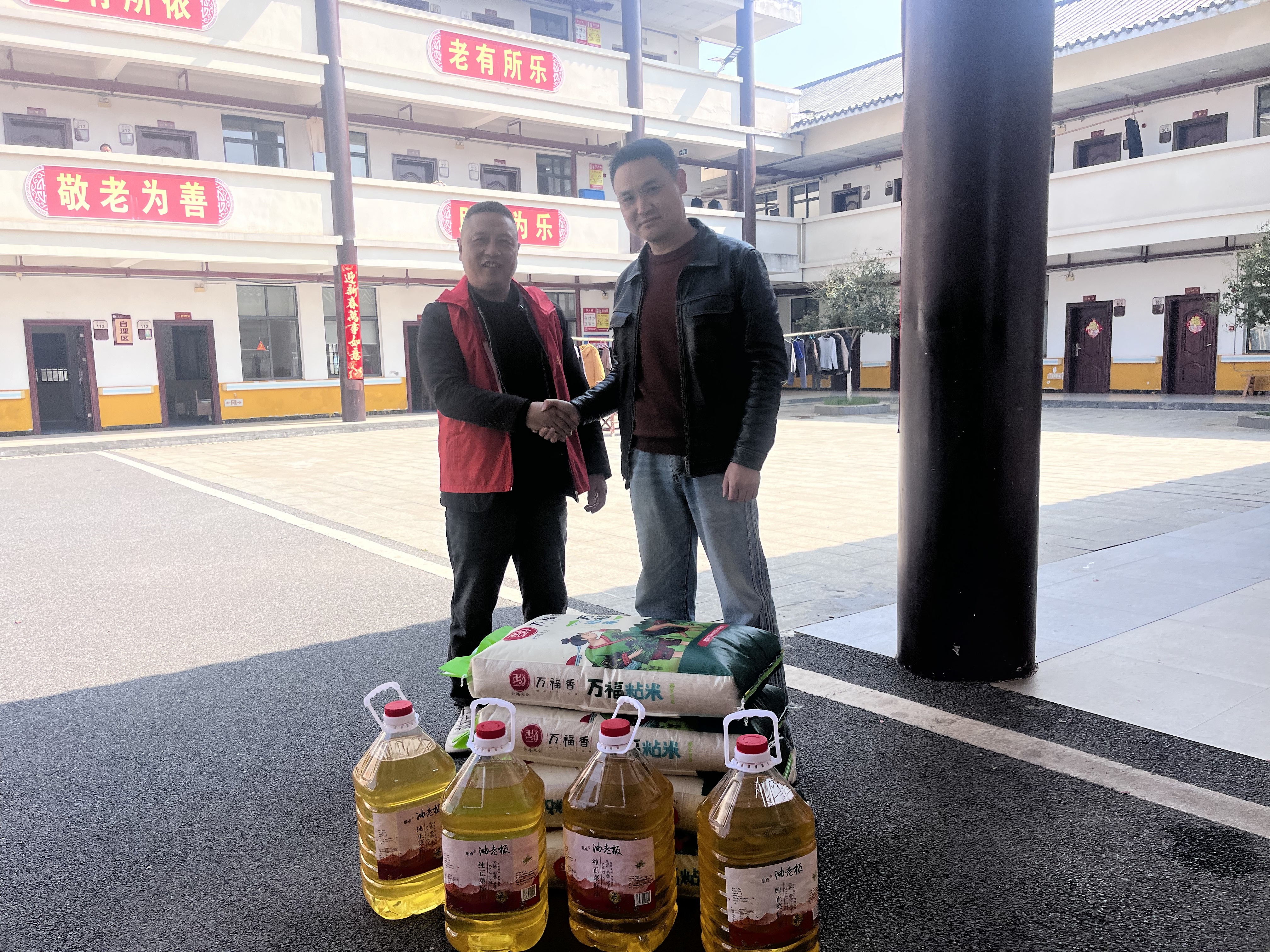 当日上午,28位志愿者身着红色志愿马甲、头戴志愿帽,手持清洁工具,在老师的带领下高举队旗,精神抖擞地前往敬老院。抵达后,校长朱勇生代表学校向敬老院捐赠大米、食用油等生活物资,与负责人亲切交流,细致询问老人们的生活起居和身体情况。