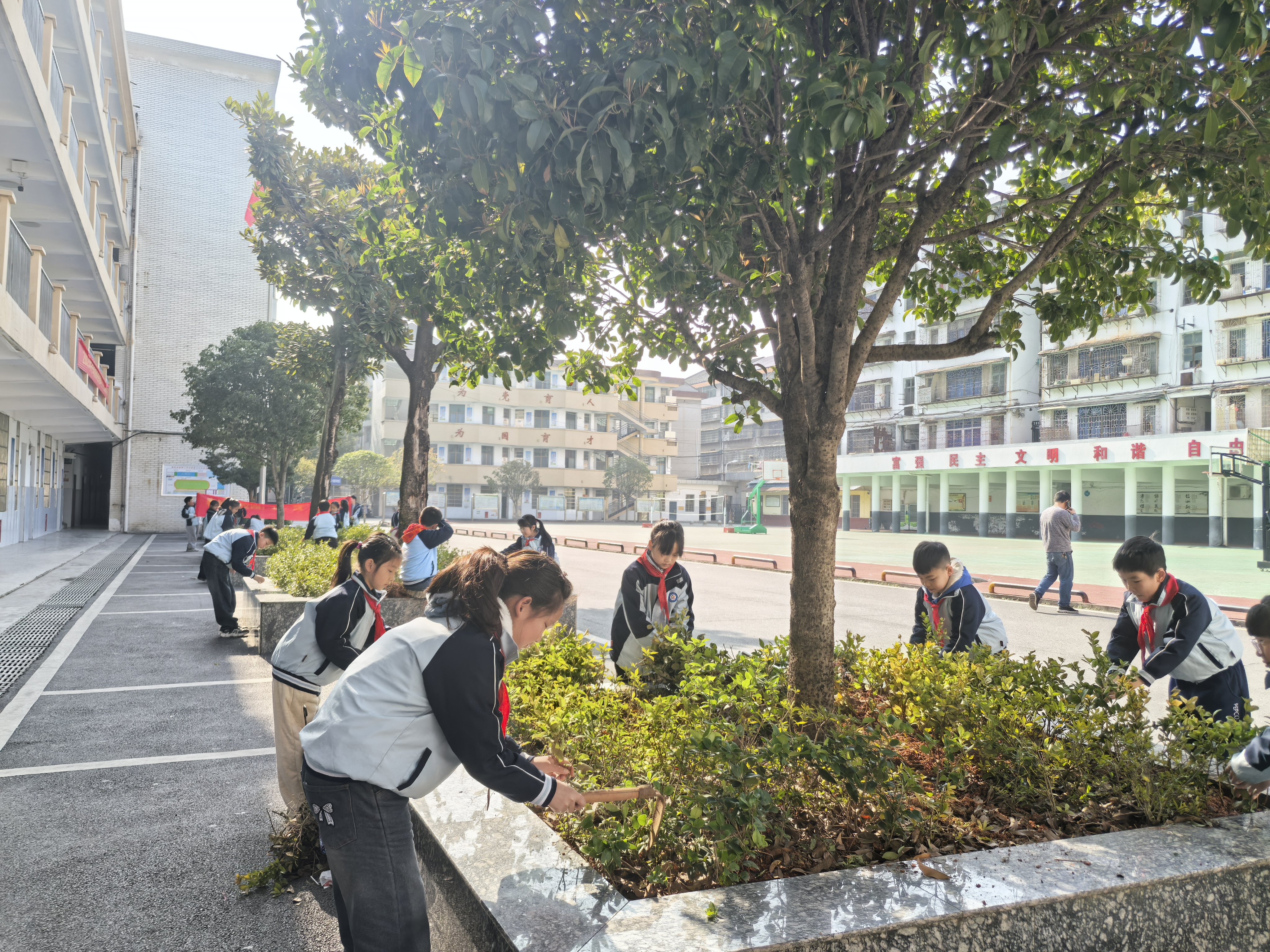 活动中,学校少先队员组成的“护绿小队”深入校园各个区域,分工协作、有序行动:有的为花坛内绿植浇水松土,悉心呵护花草生长;有的扶正、栽种新苗,为校园再添新绿;还有的认真清理绿化带内的纸屑杂物,净化校园环境。劳动现场,同学们热情高涨、干劲十足,汗水浸湿了衣衫,却挡不住脸上的笑容与心中的自豪,一个个俯身劳作的绿色身影,成为春日校园中一道温暖而亮丽的风景线。