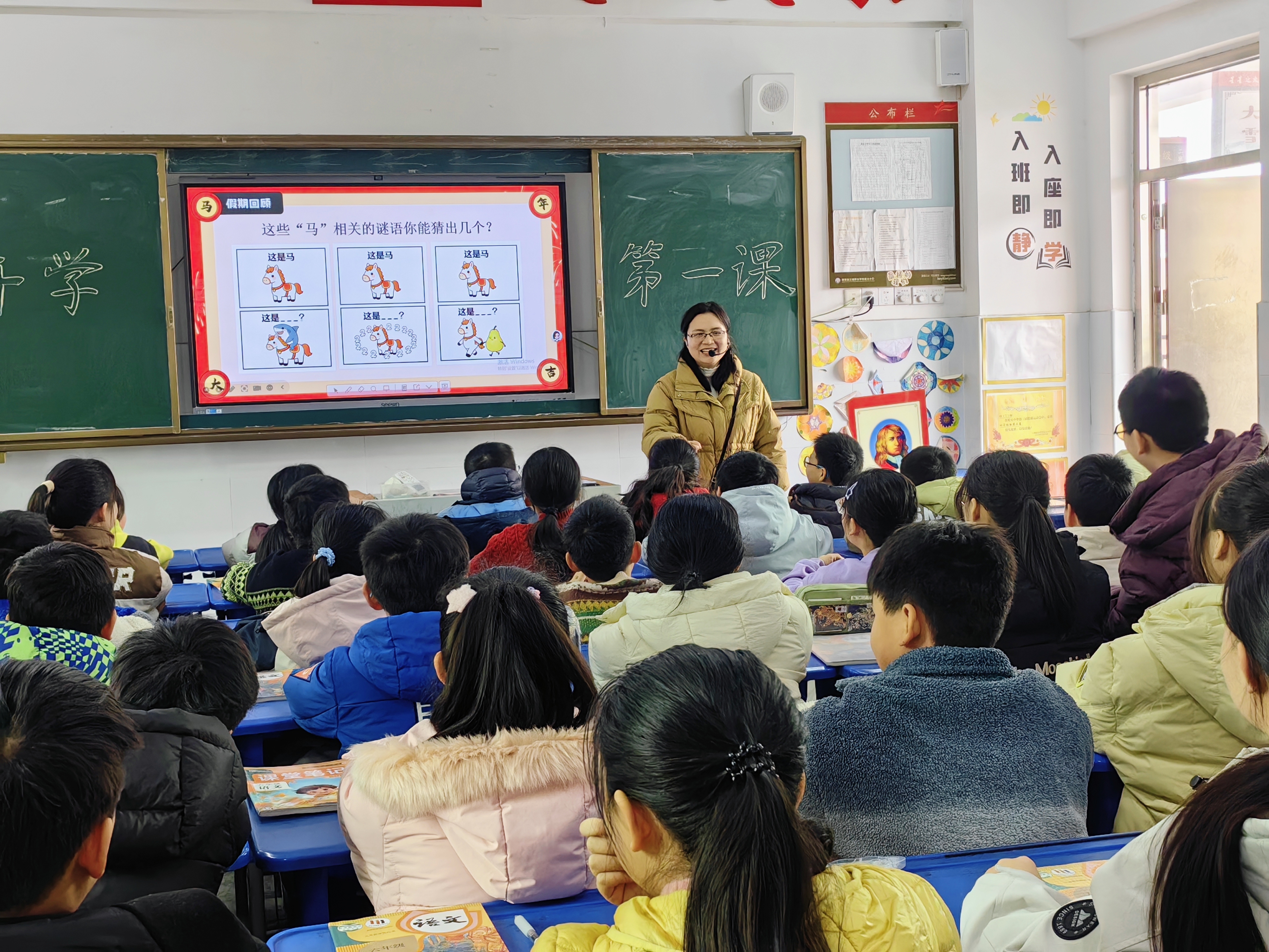 课堂伊始,趣味满满的“马上热身”环节就点燃了全场热情。大家围坐在一起,看图猜与马相关的词语,“马到成功”“千里马”“一马当先”“马后炮”……同学们踊跃举手、争相抢答,欢声笑语回荡在教室的每个角落,轻松愉悦的氛围拉满了整个课堂。借着热闹的氛围,老师为大家科普了马年小知识:马在十二生肖中位居第七,象征着勇往直前、奋发向上,“龙马精神”更是鼓励大家心怀朝气、奋力奔跑,让大家对新一年充满了力量。