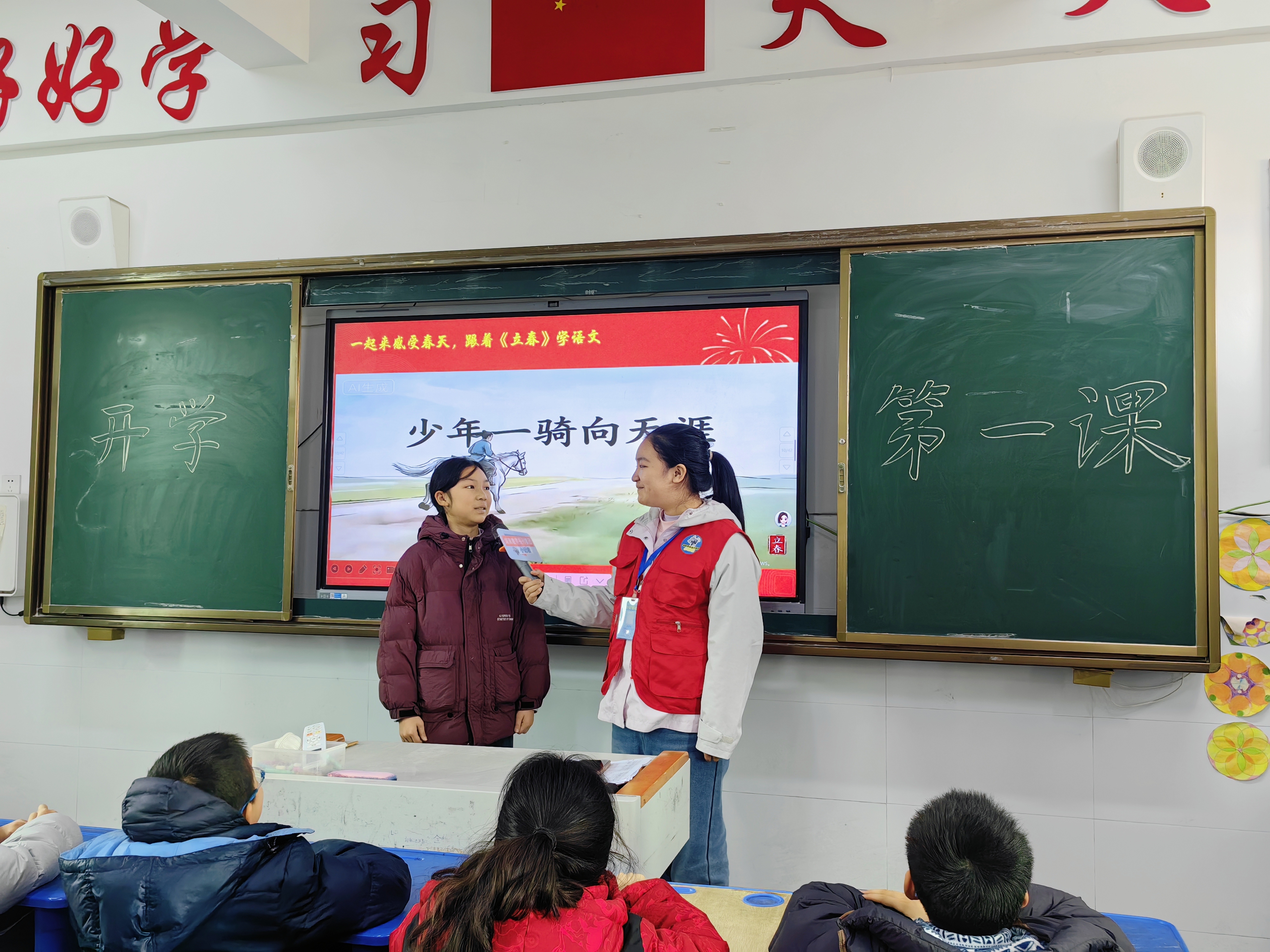 现场,小记者采访了何艾莲同学,她说道:“这节《开学第一课》特别有意思,我最喜欢机器人表演,也很喜欢《立春》这首歌。新学期我要像小马一样努力向前,好好学习,快乐成长!”