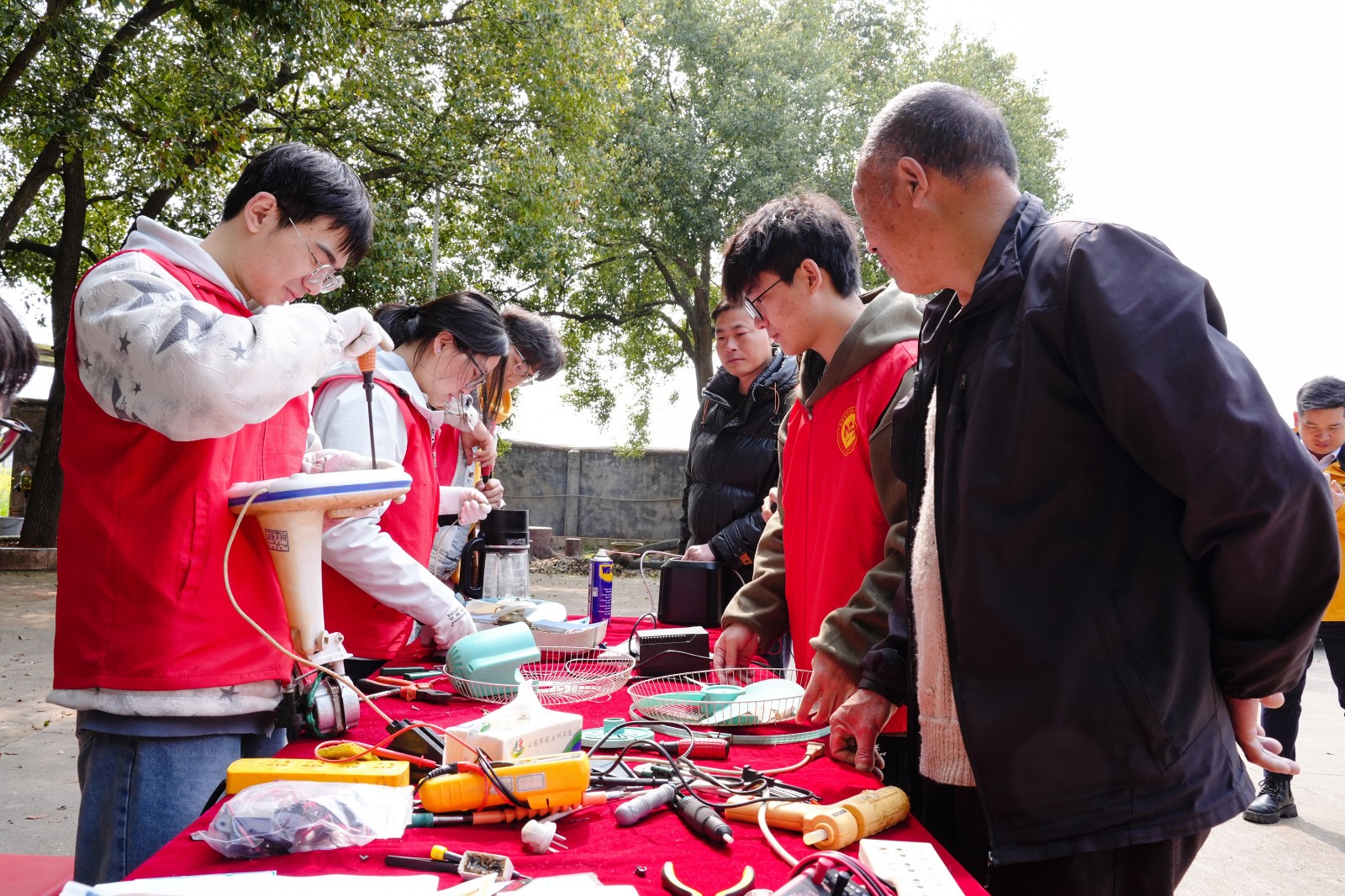 在伍家寨村文化广场上,志愿服务同样热闹。村民们拎着电风扇、电饭煲等故障家电纷至沓来,该院智能科学与技术协会的10余名师生志愿者们分工协作、拆机检测、焊接调试,动作娴熟。村民伍继恩的电风扇转不动,志愿者5分钟便排查出电容问题并修好,还手把手教他日常保养技巧。“这是儿子送的,扔了可惜,孩子们修得好还想得细,太贴心了!”伍继恩捧着修好的电风扇,笑得合不拢嘴。