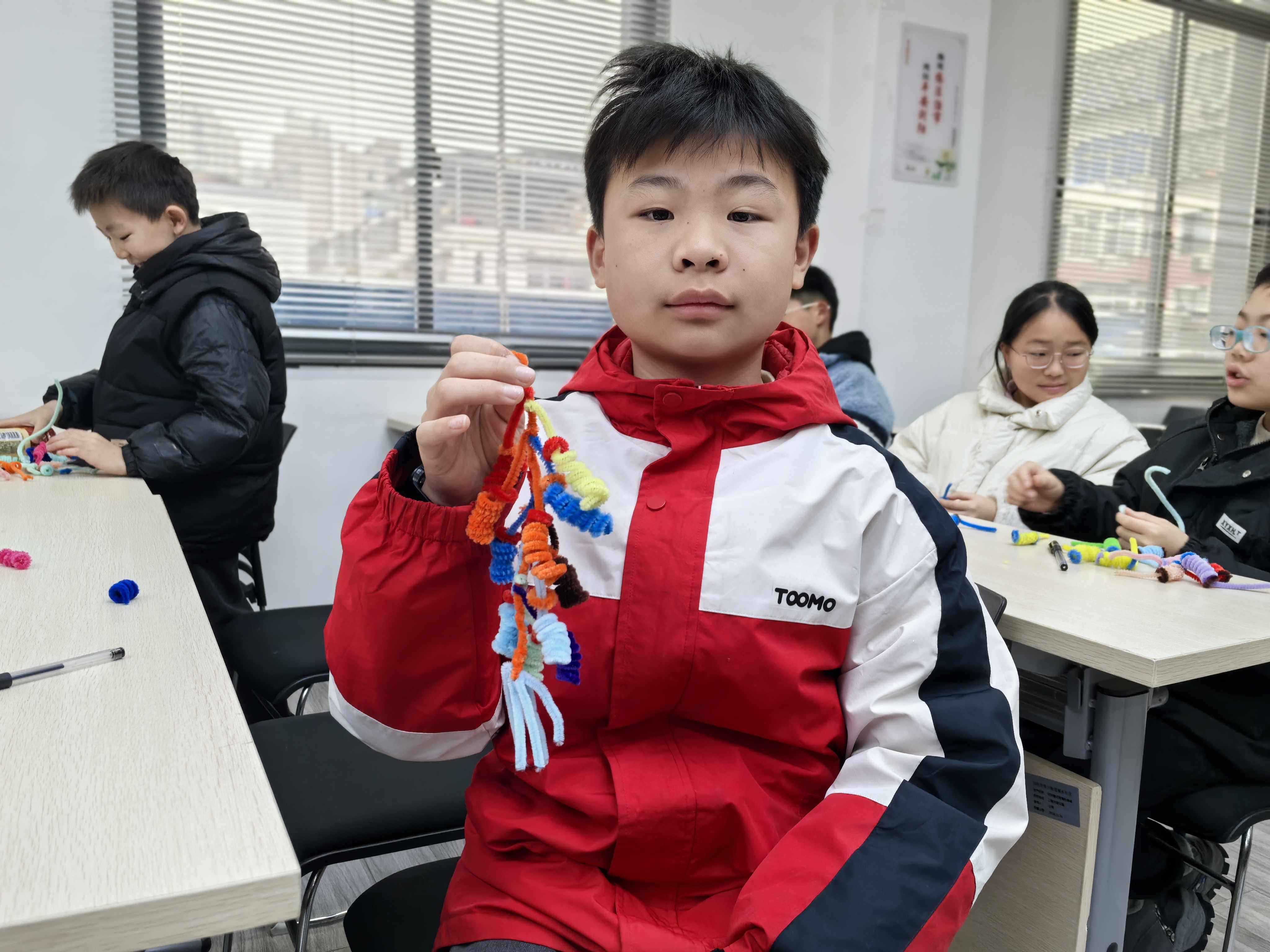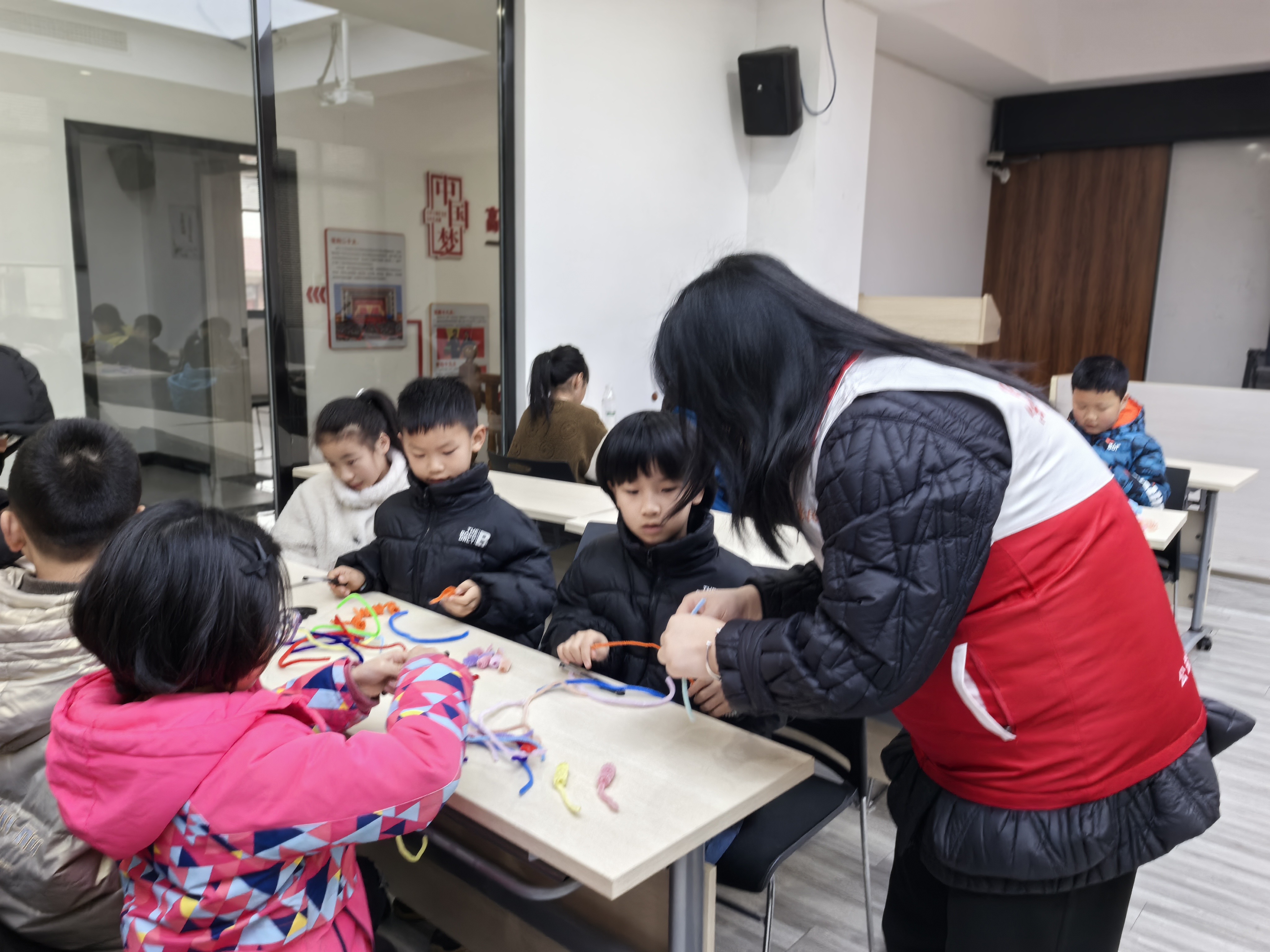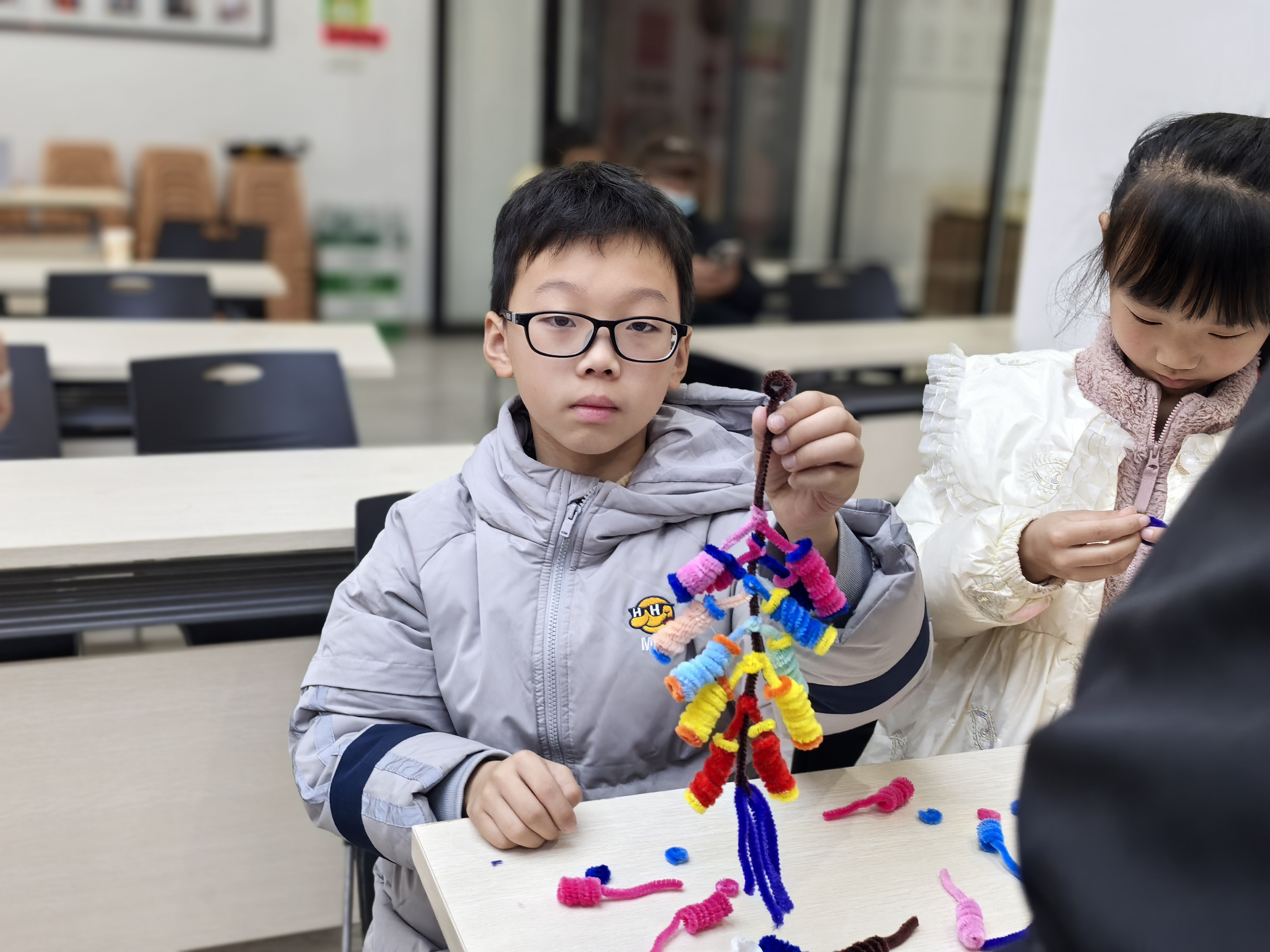 最受期待的手作体验坊环节,孩子们手持五颜六色的扭扭棒,化身“非遗小匠人”。在志愿者老师的耐心指导下,大家认真缠绕、弯折、拼接,有的小朋友歪着头调整扭扭棒的弧度,有的还在“鞭炮”上缠了小流苏做装饰,忙得不亦乐乎。一根根普通的扭扭棒,转眼变成了一串串色彩斑斓、造型可爱的“吉祥鞭炮”。孩子们专注创作的模样,成为活动室里最温暖的风景。