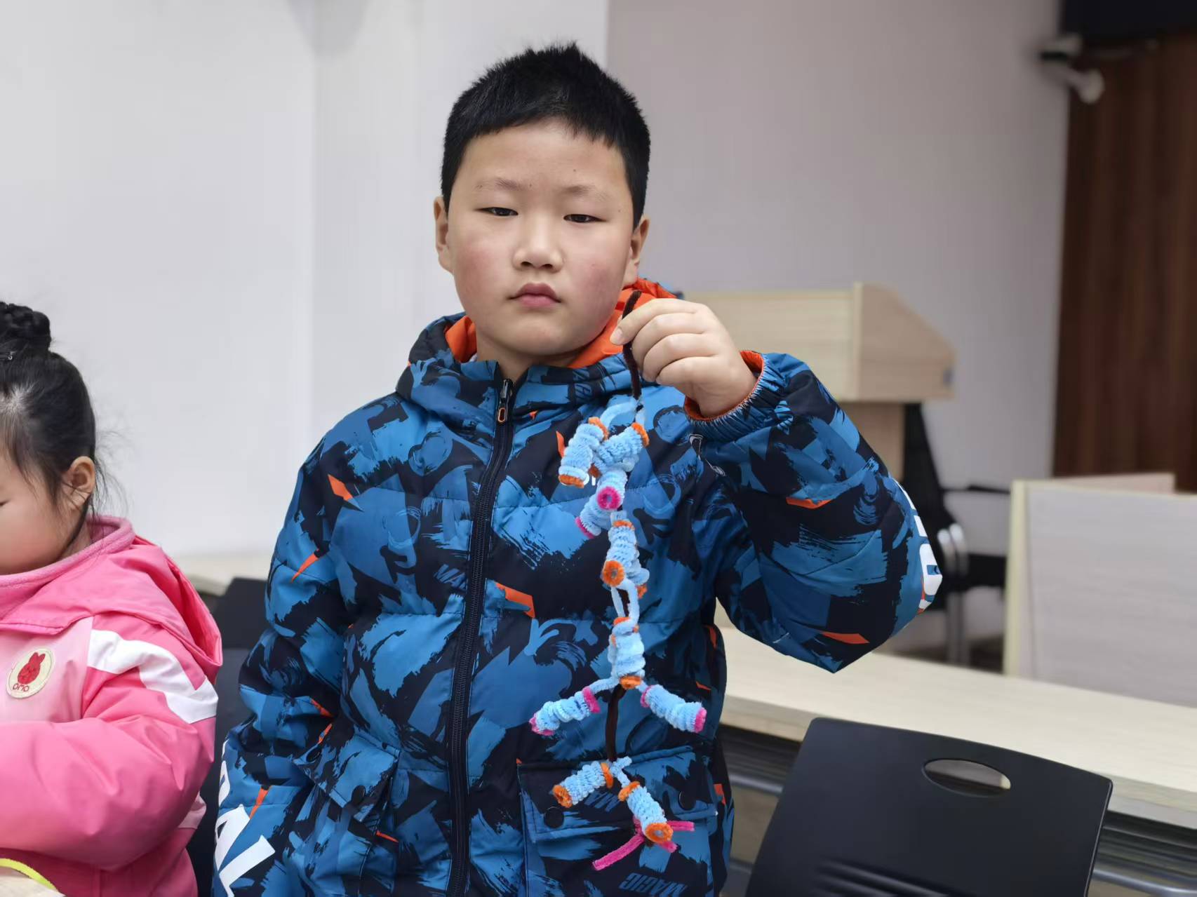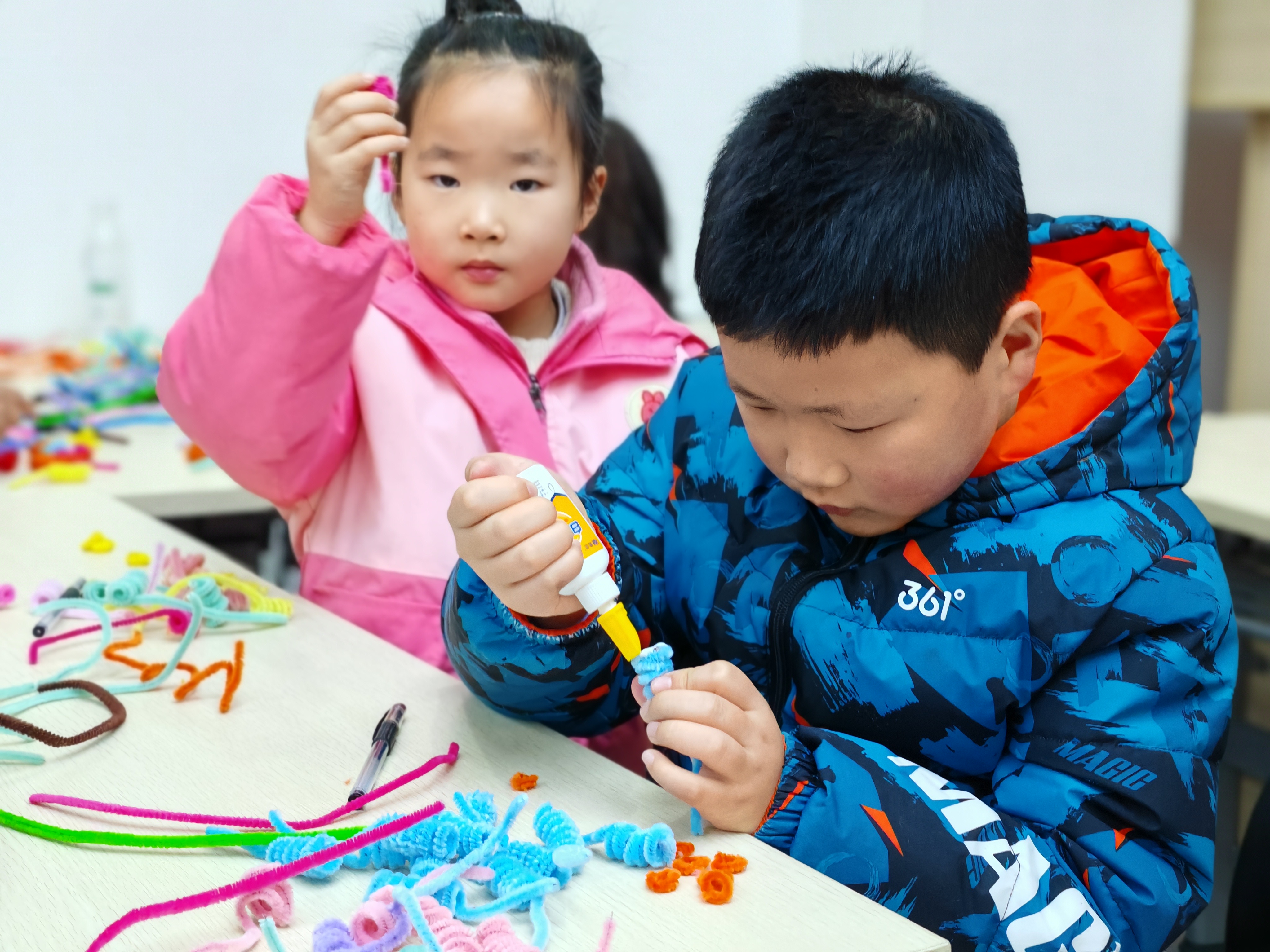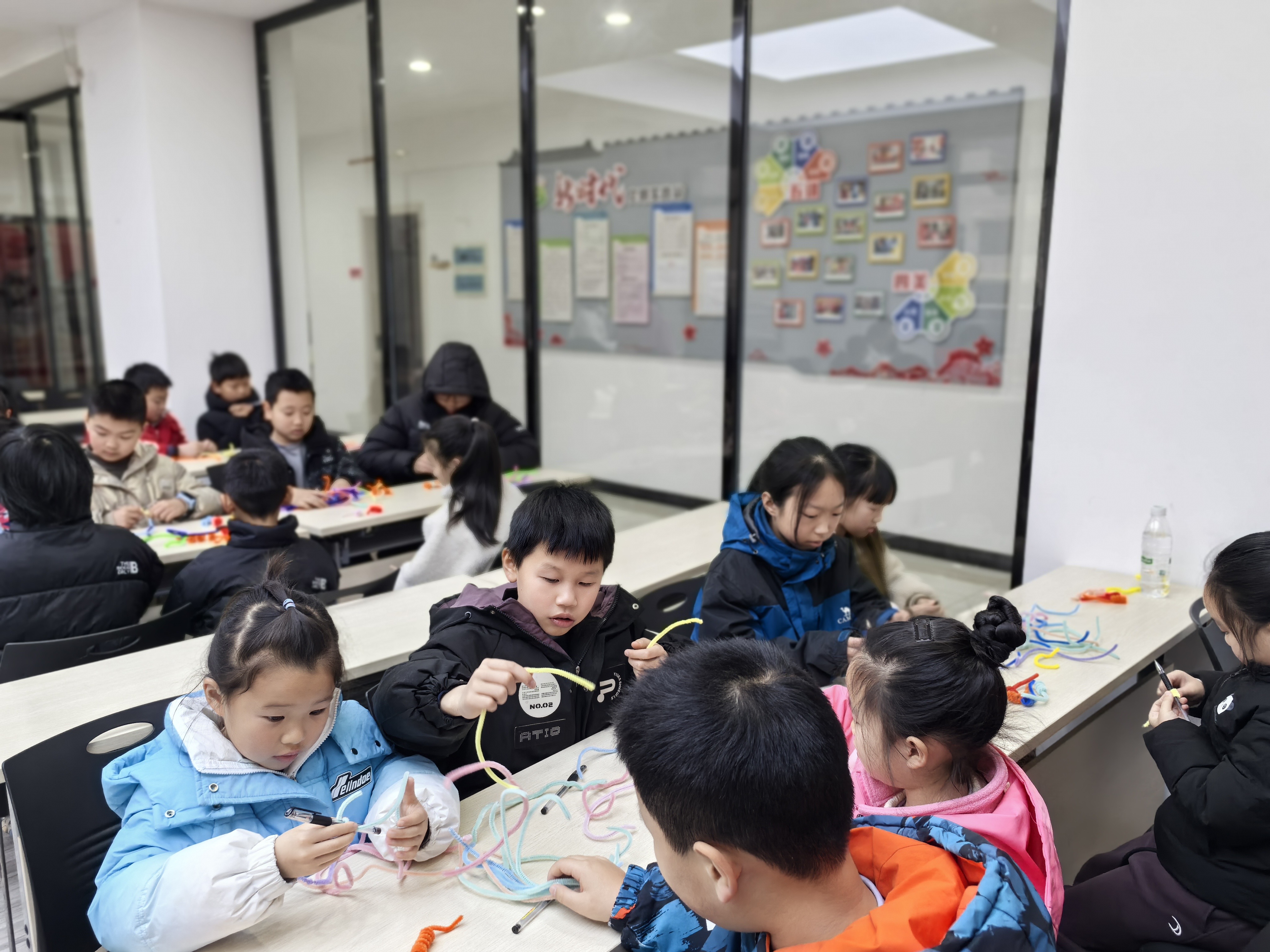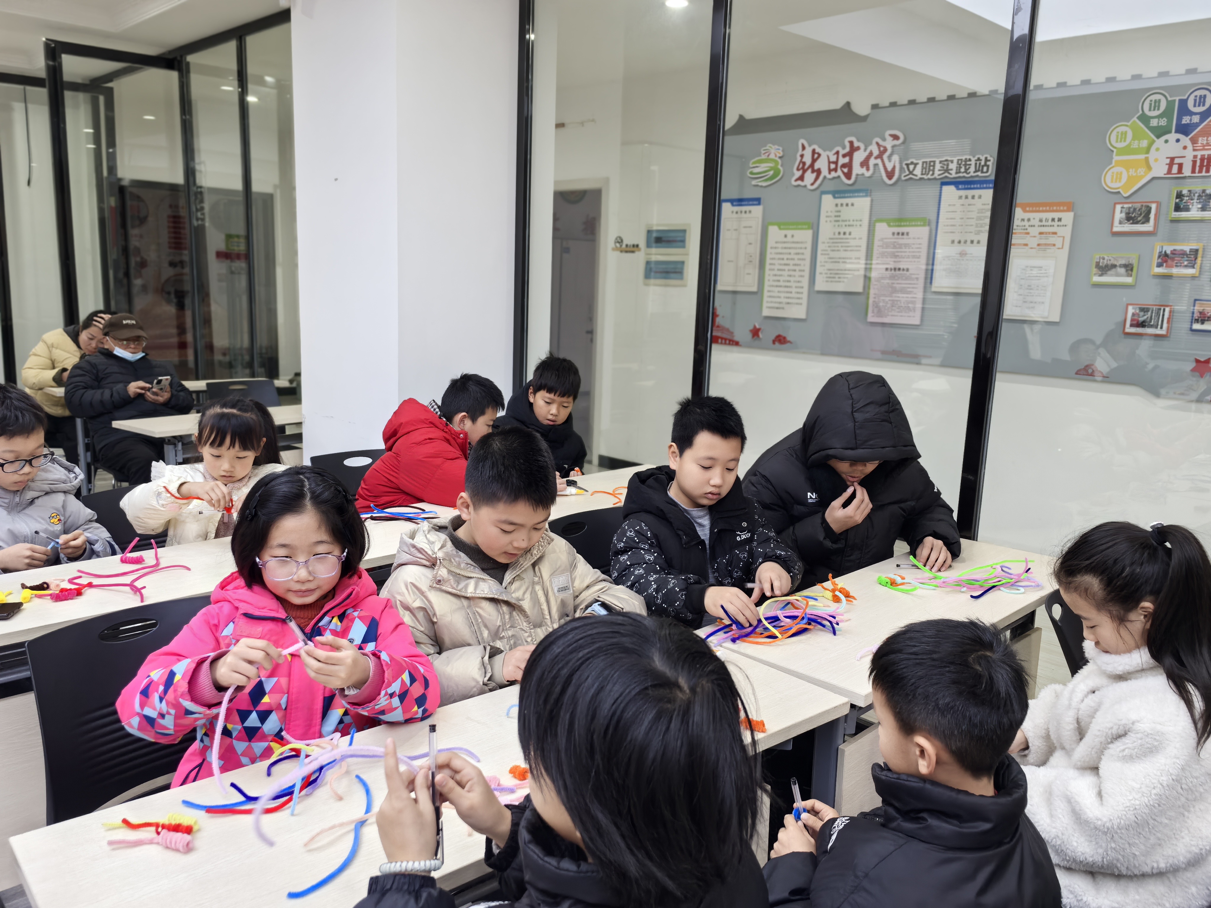 最受期待的手作体验坊环节,孩子们手持五颜六色的扭扭棒,化身“非遗小匠人”。在志愿者老师的耐心指导下,大家认真缠绕、弯折、拼接,有的小朋友歪着头调整扭扭棒的弧度,有的还在“鞭炮”上缠了小流苏做装饰,忙得不亦乐乎。一根根普通的扭扭棒,转眼变成了一串串色彩斑斓、造型可爱的“吉祥鞭炮”。孩子们专注创作的模样,成为活动室里最温暖的风景。