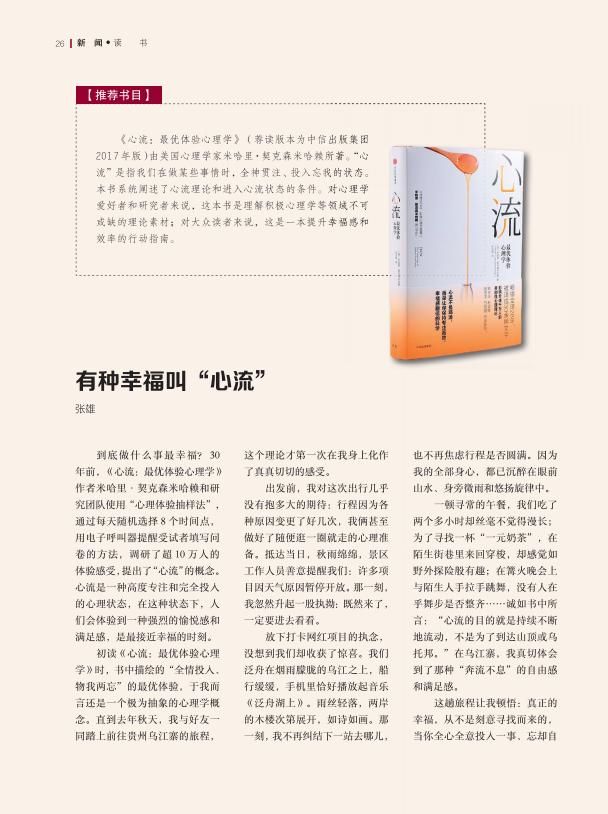 《心流:最优体验心理学》(荐读版本为中信出版集团2017年版)由美国心理学家米哈里·契克森米哈赖所著。“心流”是指我们在做某些事情时,全神贯注、投入忘我的状态。本书系统阐述了心流理论和进入心流状态的条件。对心理学爱好者和研究者来说,这本书是理解积极心理学等领域不可或缺的理论素材;对大众读者来说,这是一本提升幸福感和效率的行动指南。