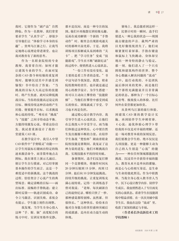 从贵州乌江寨的旅行体验,到建筑CAD课的教学设计实施,再到陪伴学生冲刺省赛,《心流:最优体验心理学》带给我的不仅是对幸福的理解,还是一场对教育本质的深刻反思。我们要教会学生的,绝不仅仅是几项技能,更是一种能够主动为自己的人生创造“心流”的能力—一种在任何领域都能找到挑战、沉浸其中并获得幸福的能力。教育从来不是单向的灌输,而是心与心的相互靠近,是生命与生命的彼此照亮。作为中职教师,当我全身心投入教书育人当中,沉下心设计教学内容、陪伴学生成长,我也悄然进入了专注而充实的心流状态。看着学生在技能训练中精益求精,在一次次突破中拔节生长,我也在这份“流动”里,收获了深深的满足与幸福。