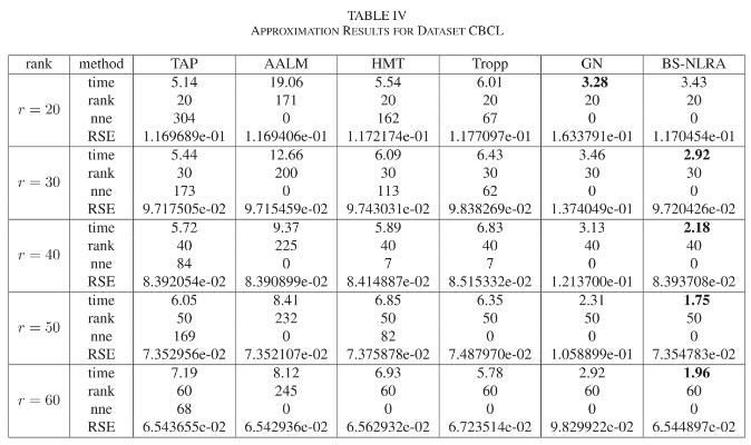针对现有求解方法难以同时严格满足低秩与非负约束、且无法保证收敛到局部极小值等瓶颈,该研究提出了一种全新的块分裂方法BS-NLRA。该方法巧妙利用QR分解将非凸的低秩约束显式转化为矩阵乘积形式,把原问题分解为一系列可并行求解的凸子问题;进而基于对偶理论将子问题转化为具有强半光滑特性的非线性方程,并设计半光滑牛顿法实现高效精确求解。理论分析表明,BS-NLRA 在每次迭代中严格保持低秩与非负约束的同时,保证目标函数值单调下降,从根本上克服了传统交替投影方法产生的中间解不可行、收敛性难以保证等缺陷。