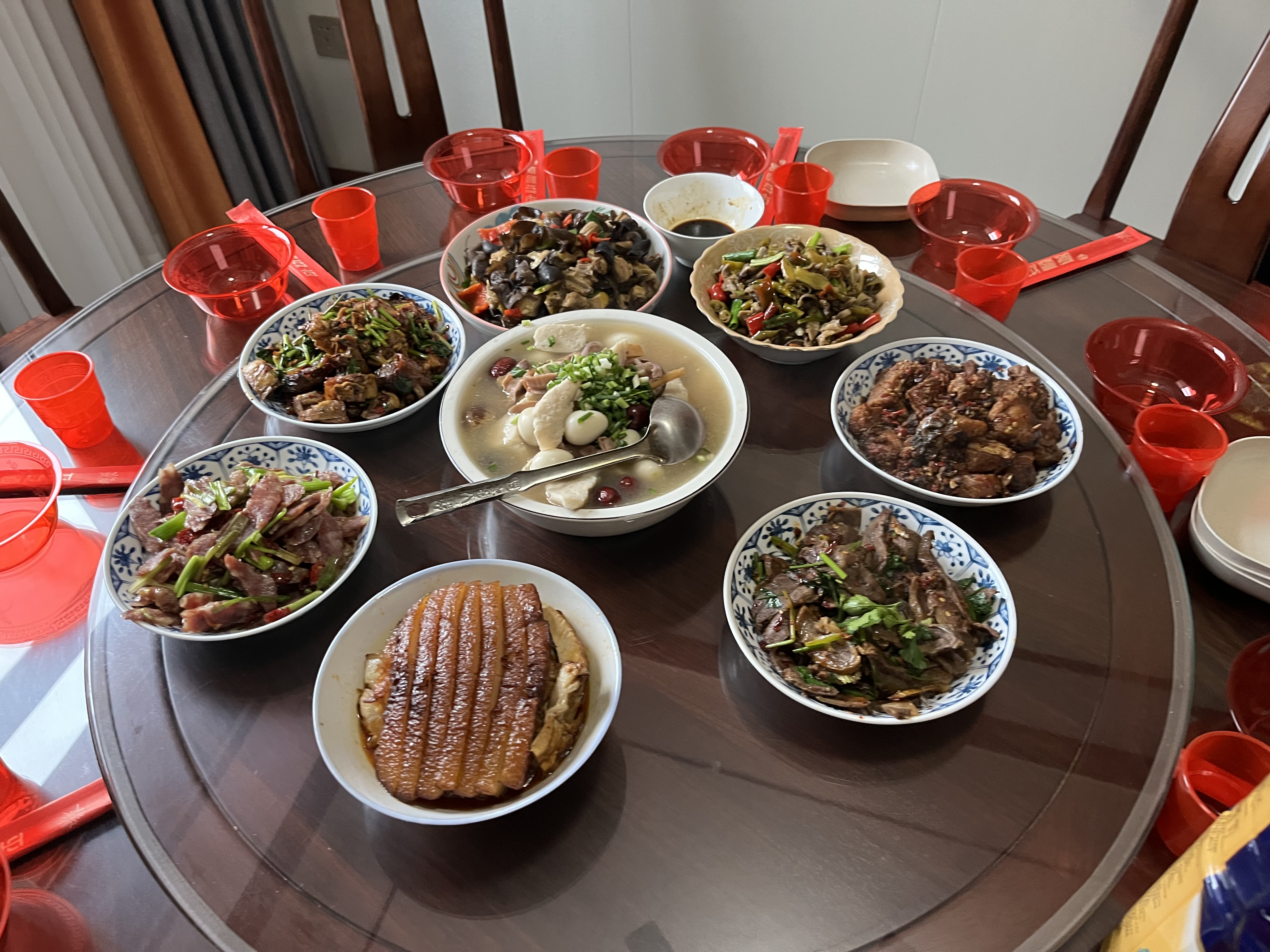 最抢眼的是正中间的扣肉,肥瘦相间的五花肉被蒸得软糯,裹着深红的酱汁,码得整整齐齐,这可是衡阳年夜饭的“主角”。旁边的草鱼丸子汤冒着热气,Q弹的丸子浮在汤里,撒上翠绿的葱花,鲜得让人直流口水。还有香辣入味的炒腊肉、滑嫩的小炒黄牛肉,每一道菜都带着外婆的手艺,藏着衡阳人的年味。