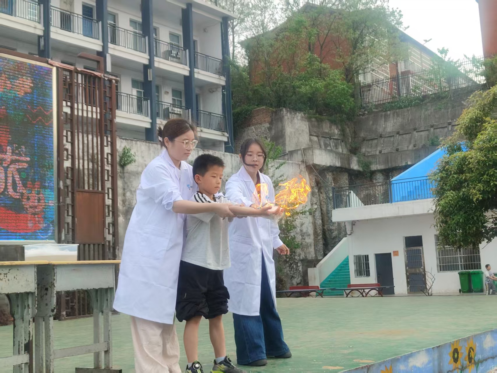 最惊险的“掌中火”实验开始了!二年级的罗熙嵘同学举着手跳得最高:“我要试试!我要试试!”工作人员把丁烷泡沫捧在手心,“噗”的一声,火焰“呼”地冒出来,又“嗖”地消失了!罗熙嵘同学兴奋地举着小手喊:“一点都不烫!就像小火苗在给我挠痒痒!” 为什么火焰不烫手?原来是丁烷烧得快,泡沫里的水会保护手,科学真的好厉害。