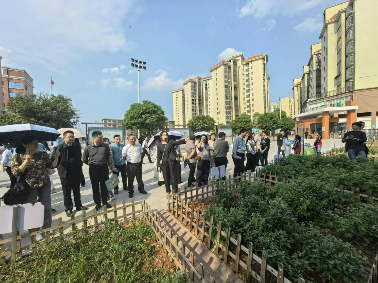 考察团移步至学校的劳动教育基地与非遗传习区。这里,学生们亲手种植的作物成为扎染、香囊、陶艺等非遗课程的天然素材,形成了“从种到收、从做到赠”的完整劳动育人链条。在非遗展演环节,226班学生带来的传统曲艺“渔鼓”表演,韵味悠长,掌声不断。陶艺室内陈列着学生自拉坯至烧制的作品,扎染区悬挂着色彩斑斓的布艺,无一不彰显着传统技艺在校园中焕发的新生机。