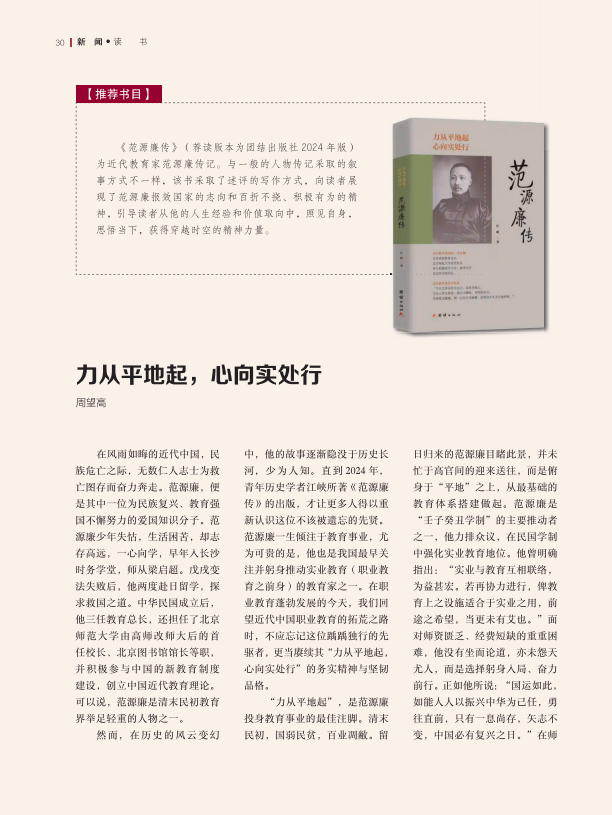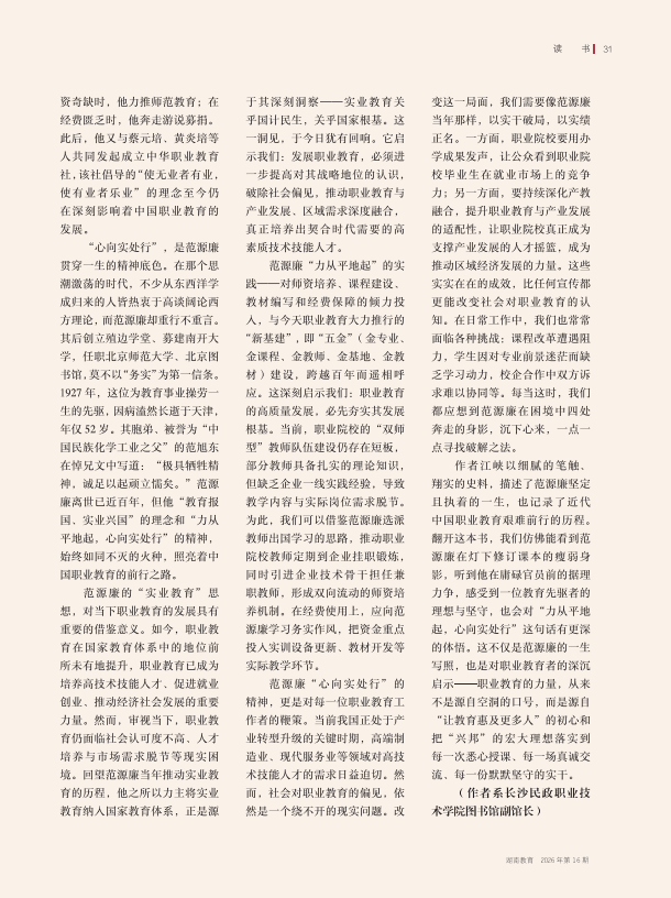 然而,在历史的风云变幻中,他的故事逐渐隐没于历史长河,少为人知。直到2024年,青年历史学者江峡所著《范源廉传》的出版,才让更多人得以重新认识这位不该被遗忘的先贤。范源廉一生倾注于教育事业,尤为可贵的是,他也是我国最早关注并躬身推动实业教育(职业教育之前身)的教育家之一。在职业教育蓬勃发展的今天,我们回望近代中国职业教育的拓荒之路时,不应忘记这位踽踽独行的先驱者,更当赓续其“力从平地起,心向实处行”的务实精神与坚韧品格。