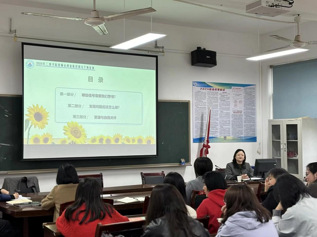 培训主讲人、该校心理中心专职教师阳沙从法治化视角切入,指出学生心理健康工作已纳入法治化轨道。她强调,掌握危机识别技能,既是落实法治要求的职业必备,也是对自身职业幸福感的一种守护。针对当前高校学生心理问题检出率上升的趋势,她分析指出,部分学生在中学阶段积累的心理压力在大学阶段集中释放,加之社会转型期部分家长对心理问题的认知存在偏差,使得高校心理健康教育面临更加复杂的挑战。