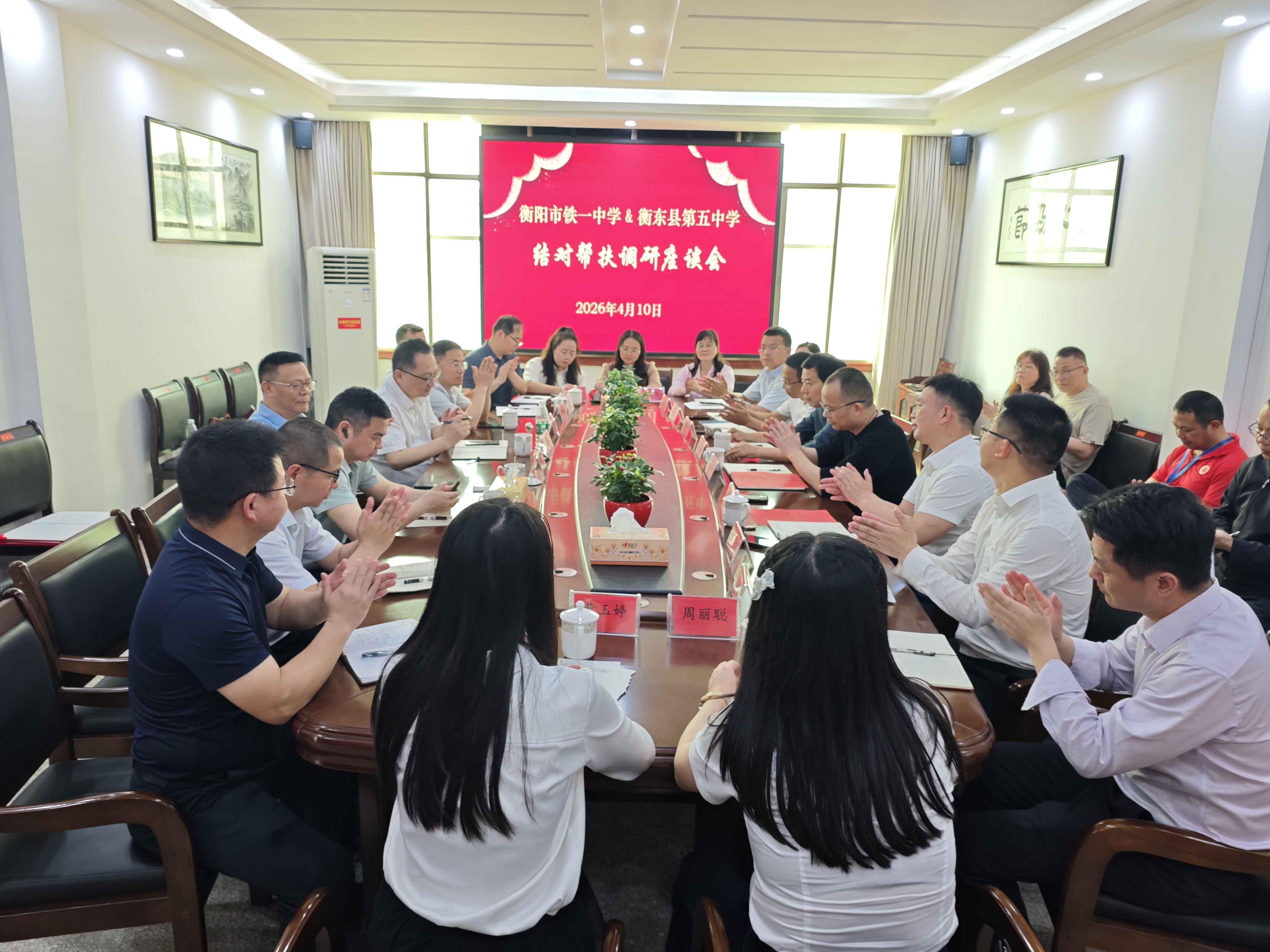 参观结束后,结对帮扶座谈会上,衡东五中党总支书记周林对衡阳市教育科学研究院、市铁一中学及衡东县教育局领导的到来表示热烈欢迎与衷心感谢;随后,衡阳市铁一中学党委书记彭书敏和衡东五中党总支书记周林分别介绍了两校的办学历史、办学理念、教育教学成果、师资队伍建设及未来发展思路;接着,两校校级领导及中层干部就学校管理、教育教学、师资建设、学生发展等方面深入交流、彼此了解,为后续精准帮扶奠定基础。