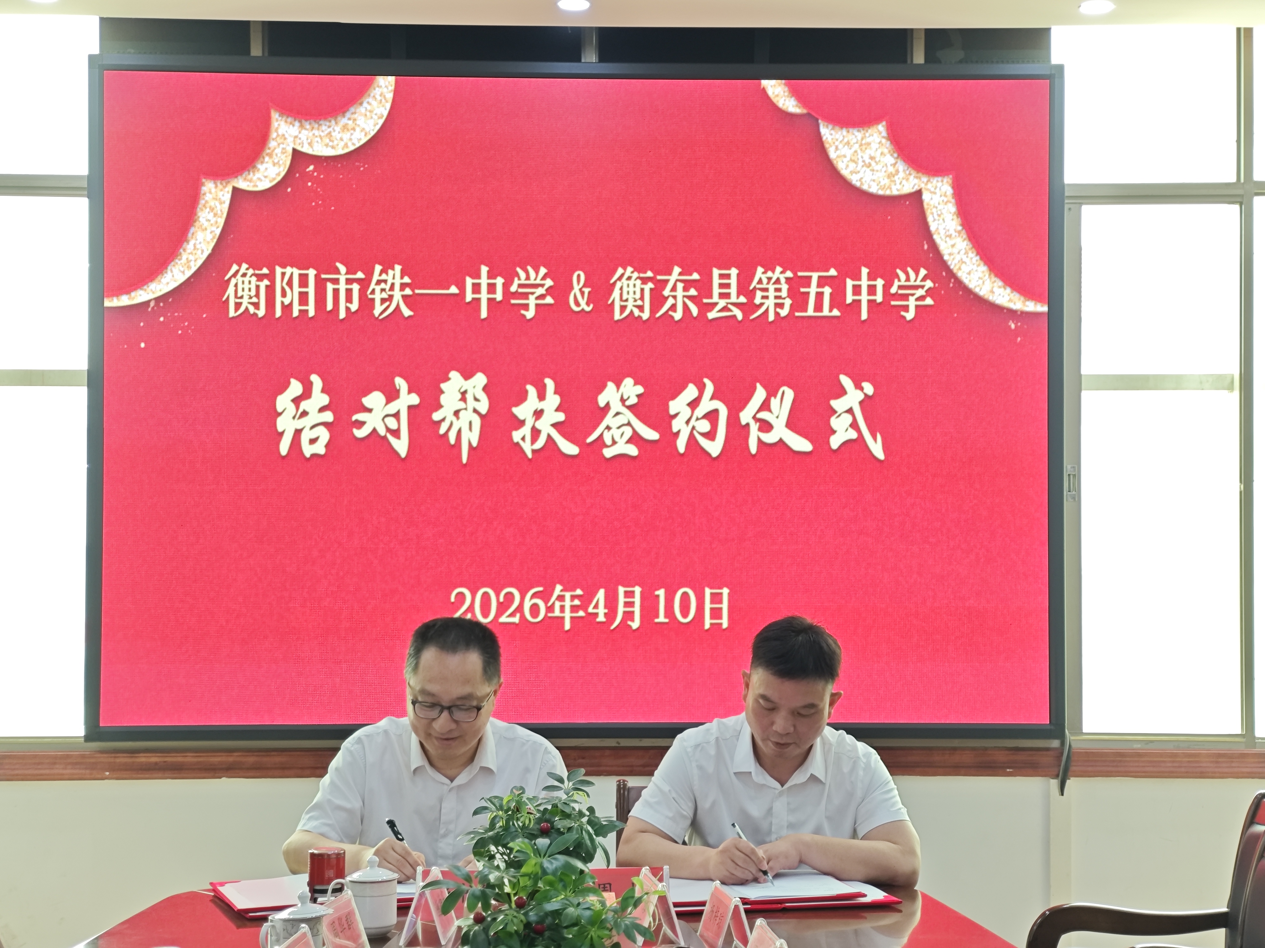 座谈会后,签约仪式正式举行。衡阳市铁一中学党委书记彭书敏回顾了两校前期的交流成果,并展望了未来合作前景。他表示,铁一中学将通过开放优质教育资源、实施名师结对帮扶、安排教师跟岗学习、联合开展课题研究等方式,在教育教学、师资培训、管理经验、科创教育等方面给予衡东五中全方位支持,以最实的举措促进两校共同成长,努力形成可复制、可借鉴的帮扶品牌。衡东五中党总支书记周林表示,衡东五中将珍惜机会,主动对标学习、积极对接落实,不断完善学校治理体系、提升教师专业能力、提高教育教学质量,通过帮扶推动学校各项工作高质量发展。随后,在全体参会人员的共同见证下,两校主要负责人共同签署《衡阳市铁一中学与衡东县第五中学结对帮扶协议》。根据协议,双方将以2026年至2028年为帮扶周期,围绕管理共建、教学共进、教研共研、师资共育、德育共融、科创共促六大维度开展全方位深度合作。殷切期望,指明方向。衡东县教育局党组成员、副局长欧阳冬文、衡阳市教育科学研究院院长唐承衡、党支部书记邓斌先后讲话,对两校开展结对帮扶给予充分肯定和祝贺,并从推进县域高中提质、促进教育优质均衡、深化校际教研共建、加强师资队伍培养等方面提出明确要求与殷切期望,为后续帮扶工作指明了方向。