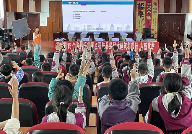 活动伊始,志愿者们用亲切真诚的自我介绍迅速拉近与孩子们的距离:“同学们,大家好!我是来自湖南工程职业技术学院的大学生科普志愿者,今天由我带领大家走进装配式建筑的小秘密。”生动的开场白瞬间点燃现场氛围,志愿者笑着与同学们互动:“大家有没有听说过装配式建筑?在生活上遇到不懂的问题,你们敢不敢大胆提问?”“敢!”台下同学们的回应整齐而响亮。“今天的课堂准备了很多有趣的小问题,希望大家带着这份好奇心和求知欲,积极参与、大胆发言!”
