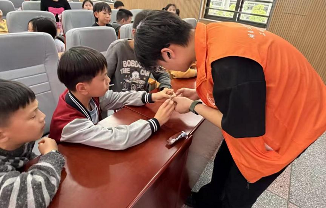 理论讲解结束后开始实践环节,志愿者们有序为同学们分发鲁班锁。面对拼装难题,志愿者们示范拆解与拼装技巧,一对一指导鼓励孩子们大胆尝试、不惧失败。从古代榫卯智慧到现代装配式建筑,志愿者们以生动讲解串联起传统与现代的建筑脉络,让同学们在动手实践中直观感受建筑智慧的传承与创新。