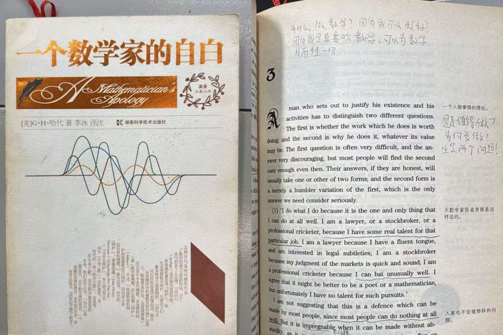 数统院龙珑老师与《一个数学家的辩白》的初遇,在20多年前。当时他刚由应用数学转入基础数学攻读博士,一度不适、迷茫。同门建议他读一读数学家哈代的书。当发现哈代这样的数学家都曾遇到过职业危机时,龙珑释然了,自己在数学道路上才准备出发,遇到困难再正常不过。这坚定了他与数学相伴的决心。