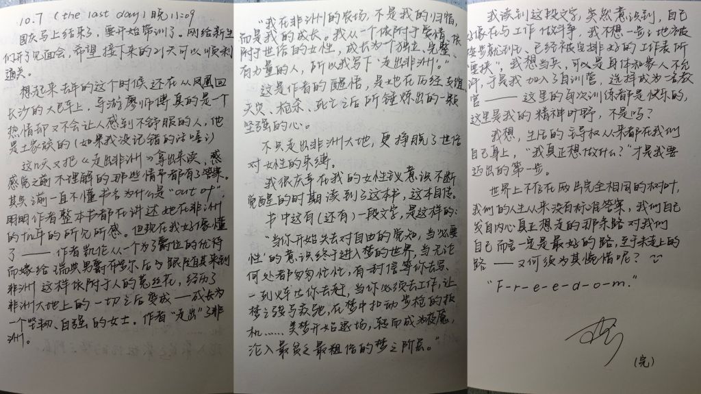 她与这本书真正深度联结,是大二时。向往成为刑诉律师的她,渴望去远方闯荡,这与父母“女孩子稳定就好”的观念相左。“家人的期许与对性别的刻板印象,让我在书中与作者产生强烈共情。”赵贝贝说,作者在对抗世俗偏见,独自经营农场,即便遇到天灾、破产与离别,也未被命运打倒的经历启发了自己。“我要做自己人生的主人,而不是困于他人目光、跟随他人脚步去做选择。”眼下,她不再渴望成为别人眼中的“好学生”,而是决心走出属于自己的路,并且计划了一场踏上非洲的旅途,赴一场与文字、与自我的约定。