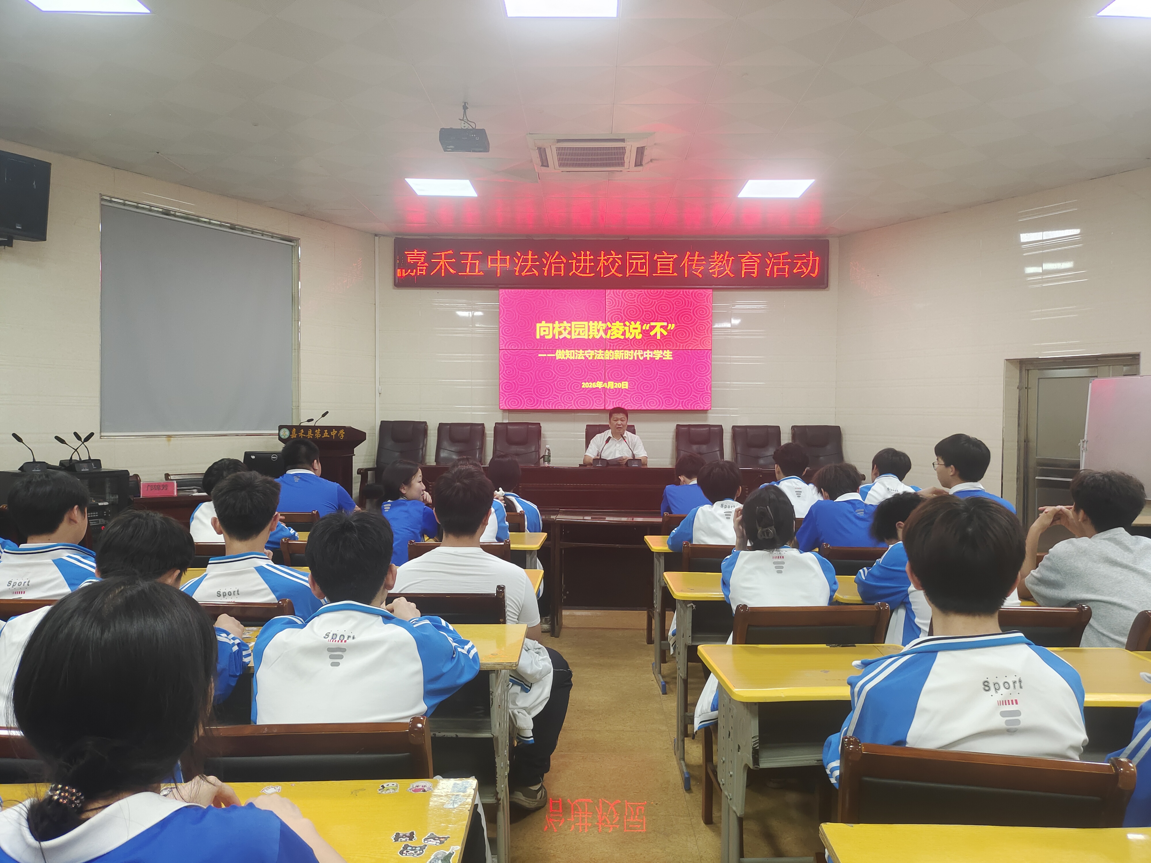 湖南教育报刊集团嘉禾县小记者站(小记者 李锦秀)“同学们要敢于向校园欺凌大声说‘不’……”主席台上,律师胡平武的话语清晰有力,传入每一位同学耳中;台下,安静的会议室里,同学们凝神倾听,时不时低头记下要点。4月20日,一场直面校园欺凌的法治教育课,正在嘉禾五中生动开展。