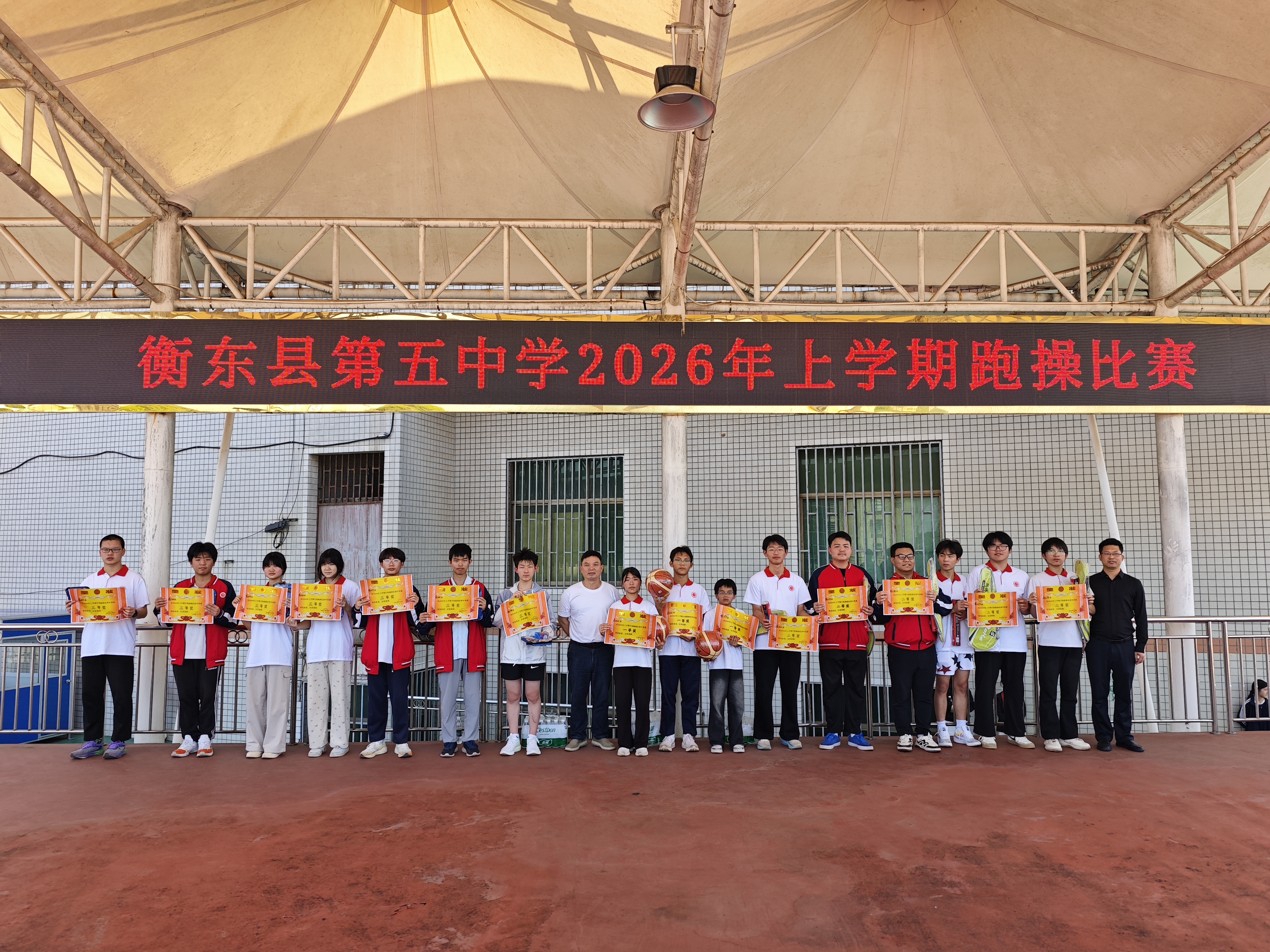 跑操展示结束后,校长秦官仂发表讲话,对同学们的精彩表现给予充分肯定,鼓励大家坚持体育锻炼,以强健体魄投入学习生活。接着,学校工会主席邓建新宣布跑操比赛获奖名单,校领导现场为获奖班级颁发荣誉,表彰优秀、树立榜样,也让奋进的力量在校园里不断传递。