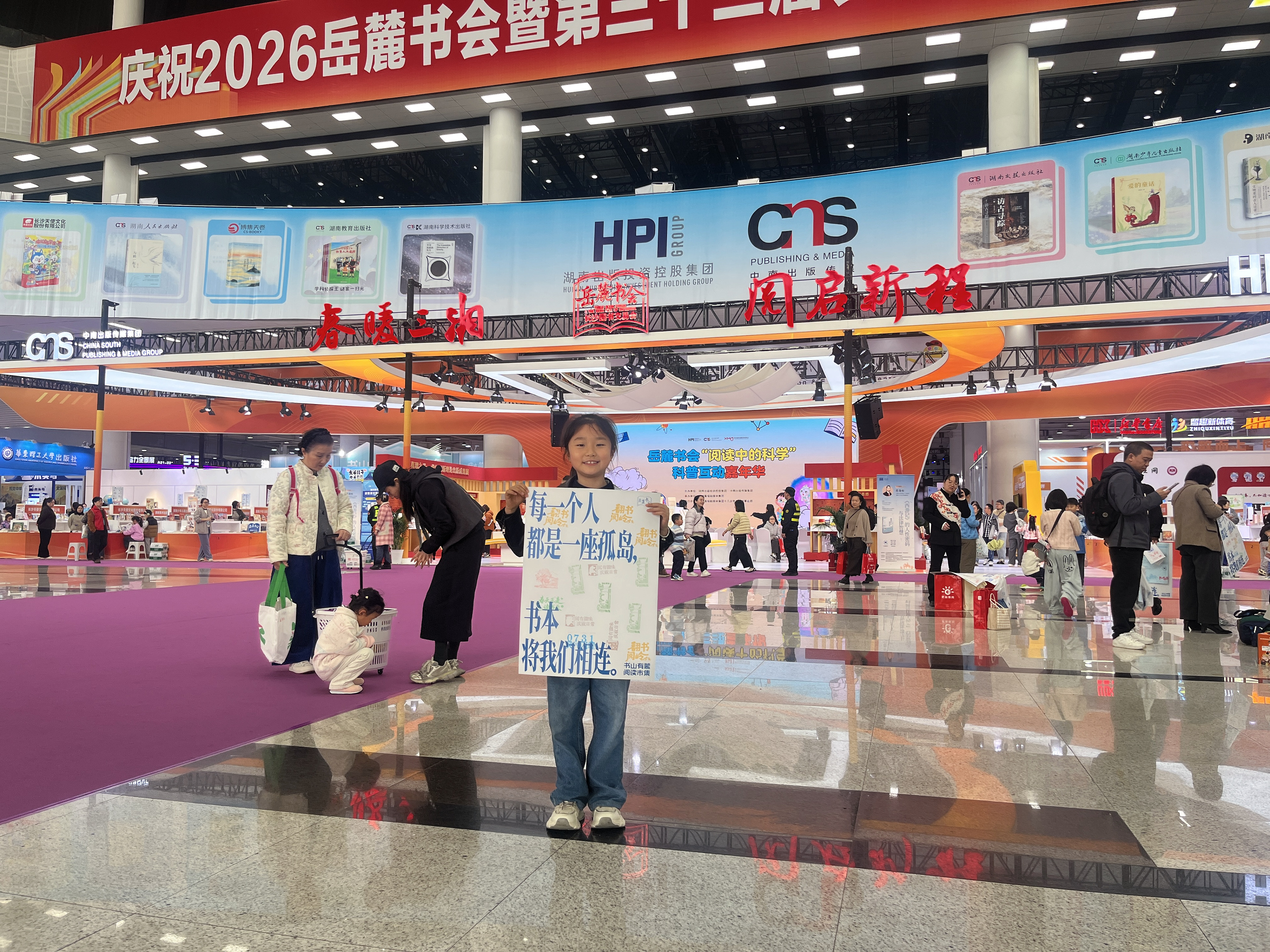 一进展厅,仿佛置身于书的海洋,上方“春暖三湘 阅启新程”的标语格外醒目,各大出版社的展区整齐排列,空气中弥漫着浓浓的书香,让人心旷神怡。下图是我在2026岳麓书会主会场打卡,手持“每一个人都是一座孤岛,书本将我们相连”的标语牌,传递阅读的温暖力量。