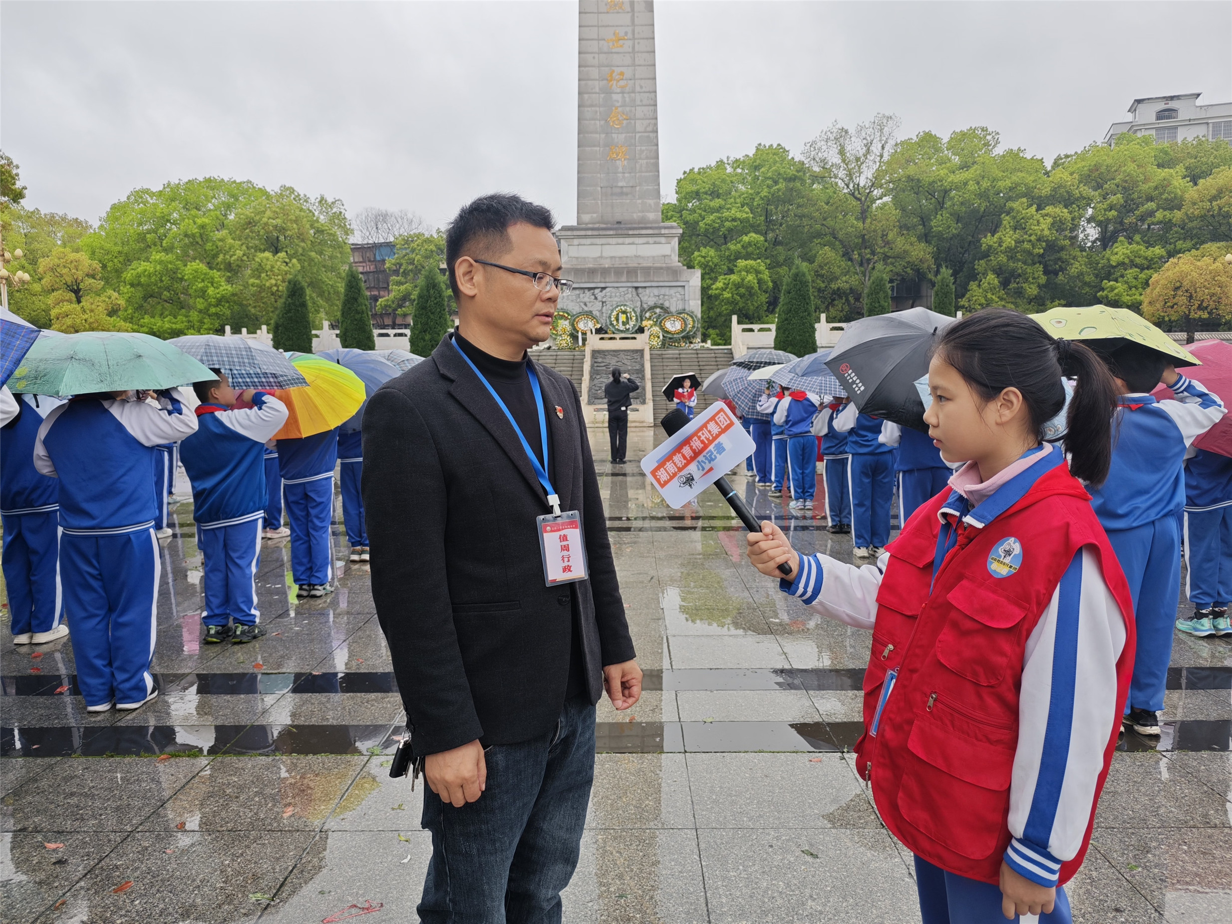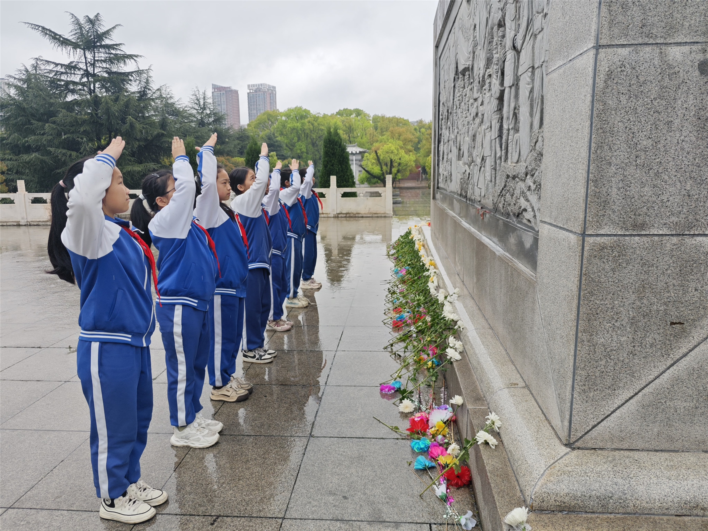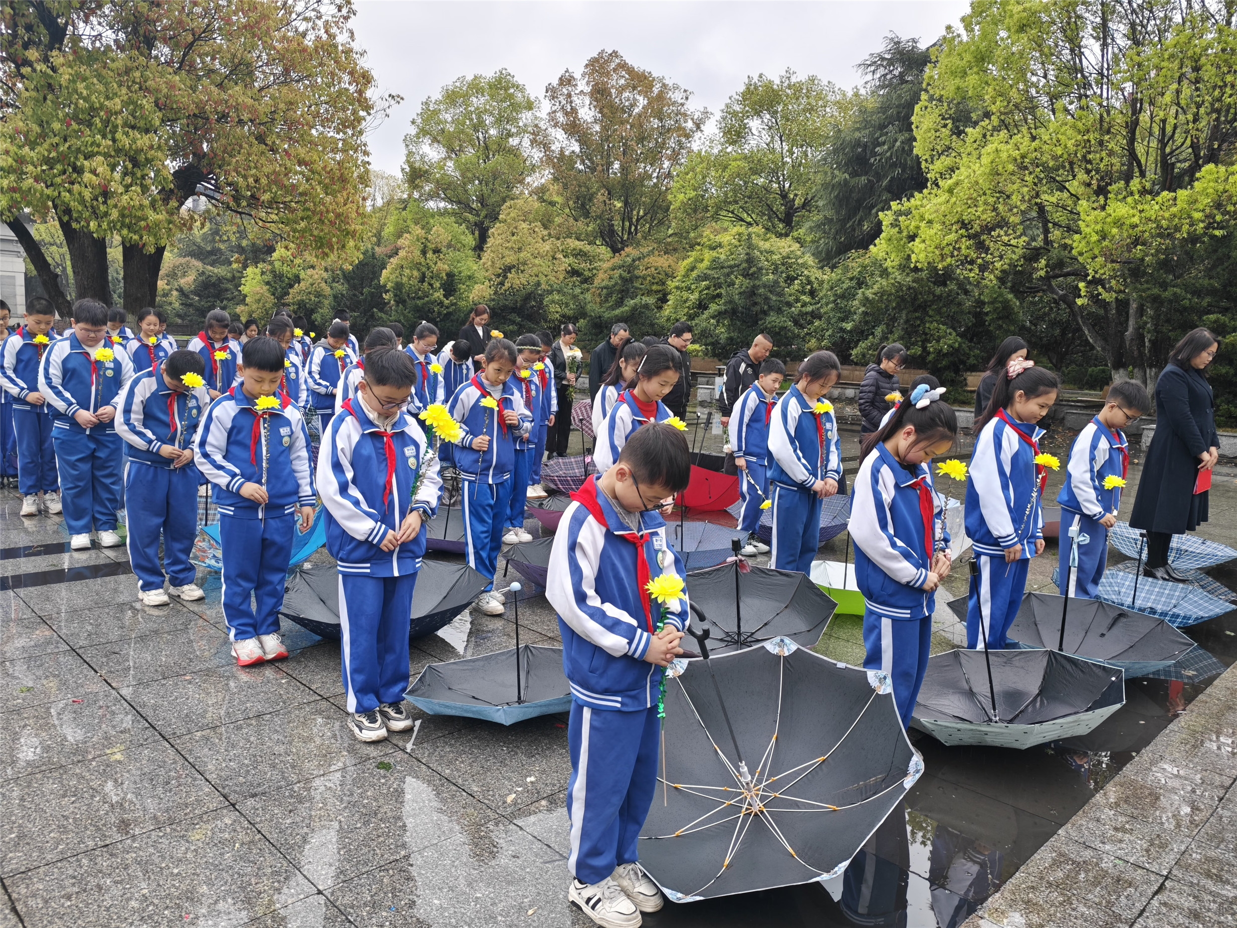 当日上午,春雨如泣,烈士陵园庄严肃穆。纪念碑前,师生们整齐列队,手持鲜花,静静伫立。活动在少先队员高唱《我们是共产主义接班人》中拉开序幕。接着,党员代表敬献花圈,全体师生默哀致敬。