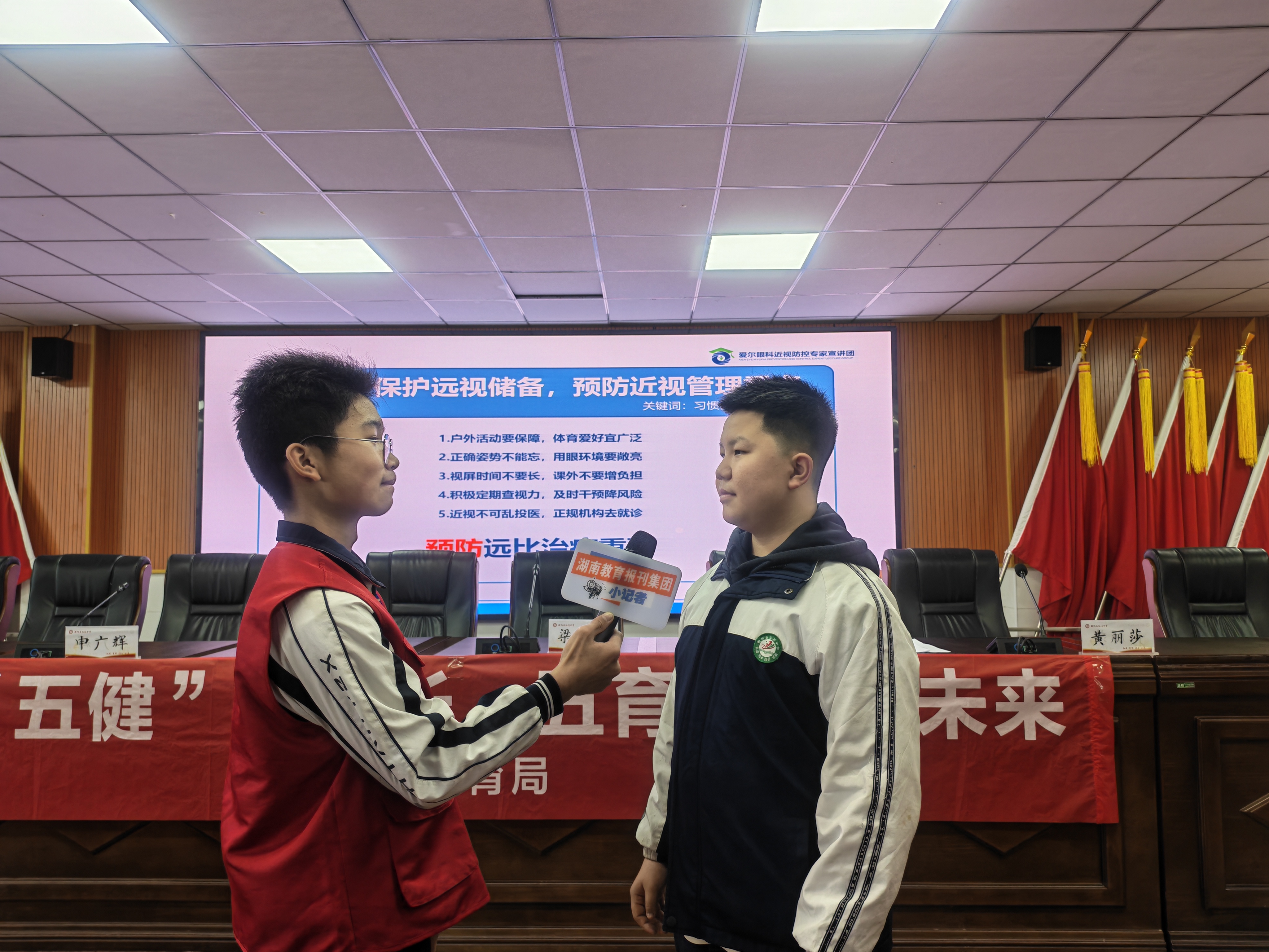 衡阳县教育局体卫艺股股长梁增科接受小记者采访时说:“我们会以这次推进会为新的起点,继续把衡阳县健康校园建设做得更好,把近视防控工作抓细抓实,用体育让同学们强身健体,用艺术滋润大家心灵,用卫生防护为成长保驾护航,守护每一位衡阳县学子身心健康,全面发展。”