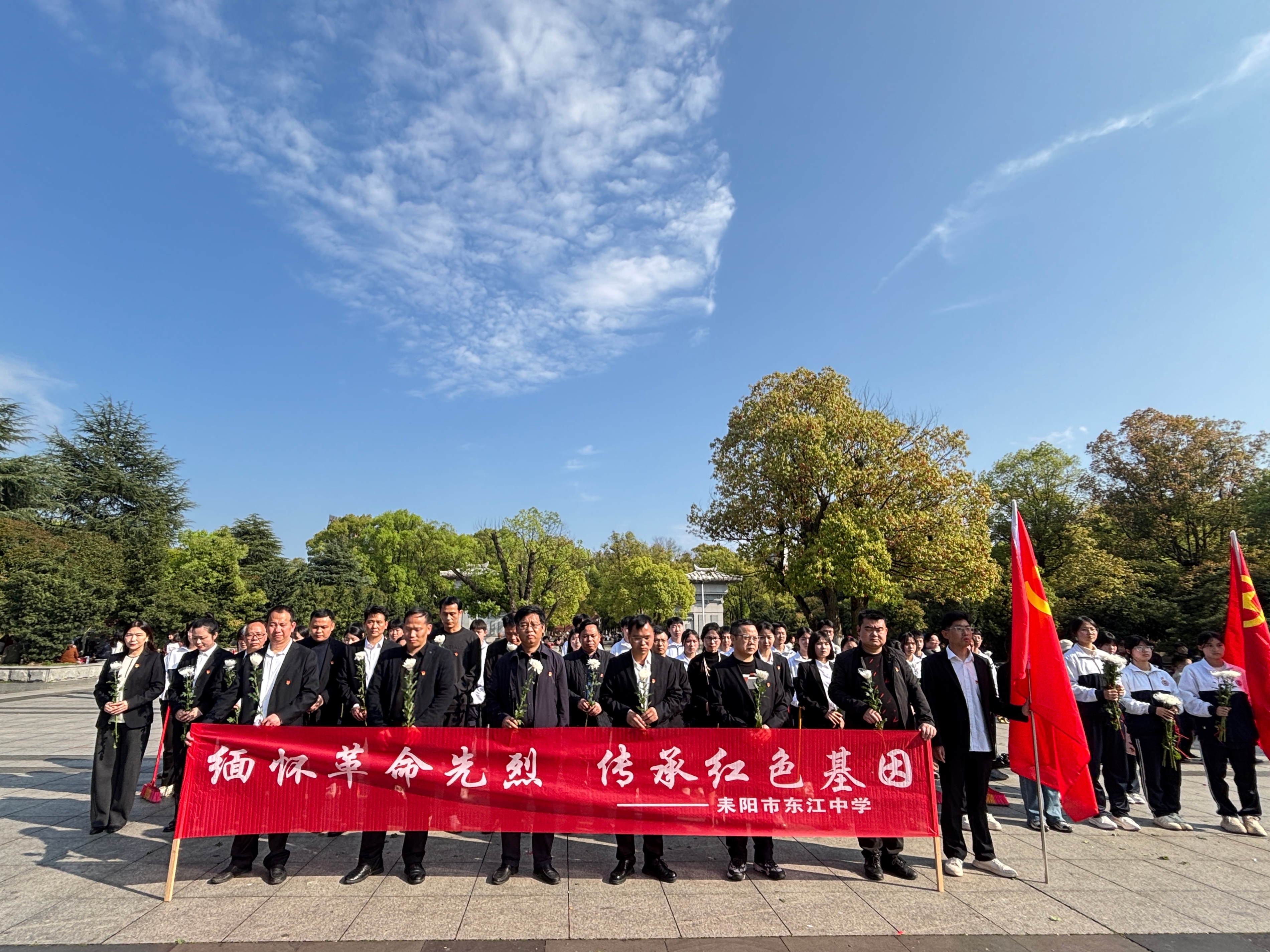 湖南教育报刊集团耒阳小记者站(小记者 杨琳) 4月1日下午,耒阳市东江中学百余名党员教师和团员学生代表走进烈士陵园,在革命英雄纪念碑前庄严开展“缅怀革命先烈 传承红色基因”主题党团日活动,同上了一堂“行走的思政课”。