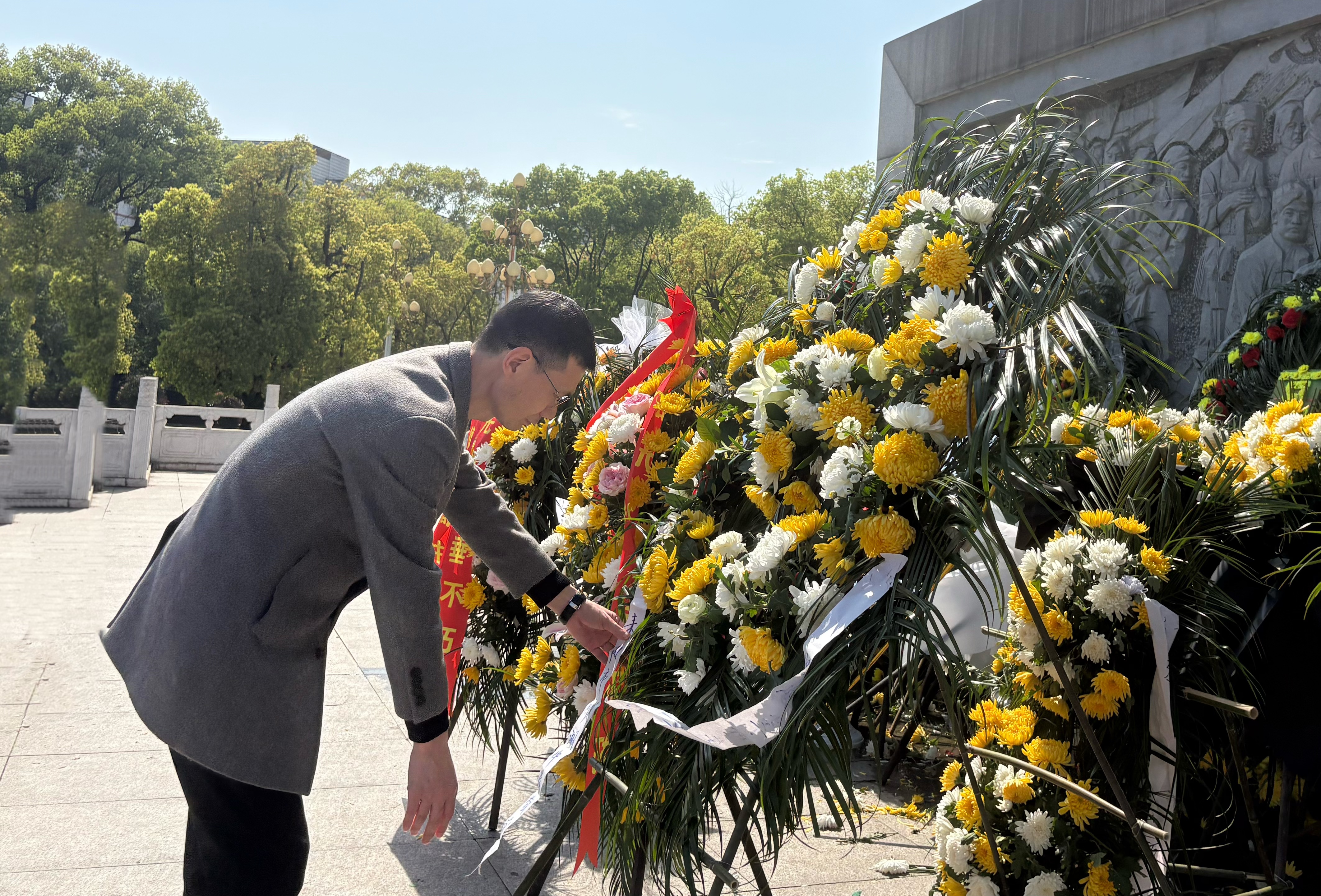 敬献花篮环节,党员教师代表与团员代表缓步走向纪念碑,怀着无比崇敬的心情向烈士们敬献花篮。党总支书记蒋国华上前仔细整理花篮缎带。紧接着,全体人员向为民族独立、人民解放和国家富强英勇献身的革命先烈默哀一分钟。暖阳轻拂陵园,静默之中,大家深切感悟今日幸福生活的来之不易。