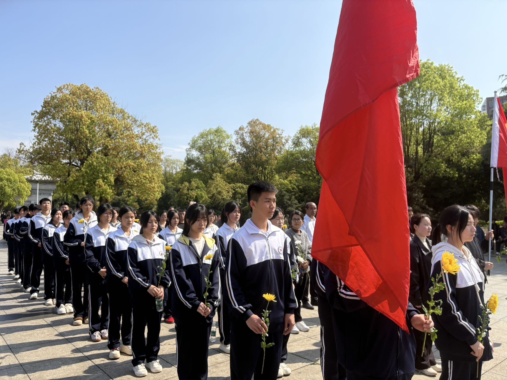 “今天阳光明媚,就像先烈的精神一样温暖人心。作为高一学生,我会把这份敬意转化为学习的动力,不辜负先烈们用生命换来的和平年代,也不辜负学校的培养。”高一团员代表陈欢感慨。