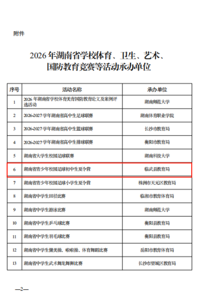 湖南教育新闻网讯(通讯员 李赟)近日,从湖南省教育厅传来喜讯,临武县成功获得2026年湖南省青少年校园足球初中生夏令营承办资格,这是对该县校园足球发展成效的高度认可,也是其推动体教深度融合的重要契机。