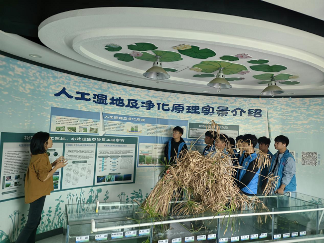 在松雅湖国家湿地公园宣教中心,师生们在讲解员的带领下,深入了解了人工湿地及净化原理。通过实景展示和图文介绍,大家直观认识到湿地植物在水质净化、生态平衡中发挥的关键作用,学习了松雅湖人工湿地建设的工程案例,将课堂理论与实际生态工程进行了有效衔接。
