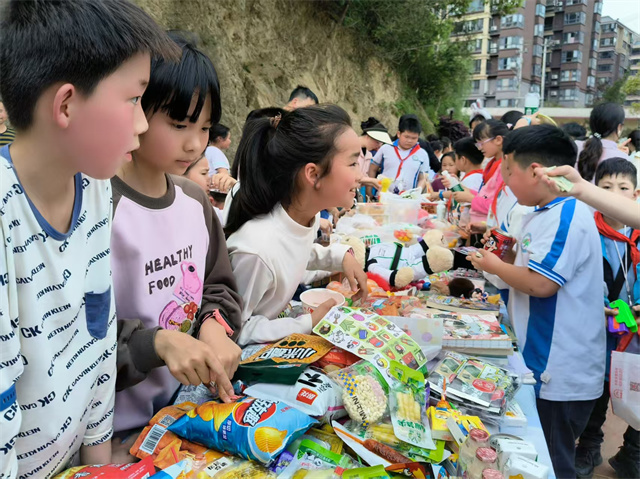 操场上,28个班级展位如春花绽放。三年(2)班的雷锋主题手绘展板前,红领巾讲解员正讲述雷锋故事;五年(1)班用七彩气球搭起“爱心拱门”,手作侗乡米豆腐吸引众人驻足。孩子们化身“掌柜”与“顾客”,在角色转换间体验劳动价值。“卖出5本书捐出30元,能帮到同学特别开心!”四年级学生杨艺欣擦拭着额头的汗珠,把义卖所得郑重投入捐款箱。