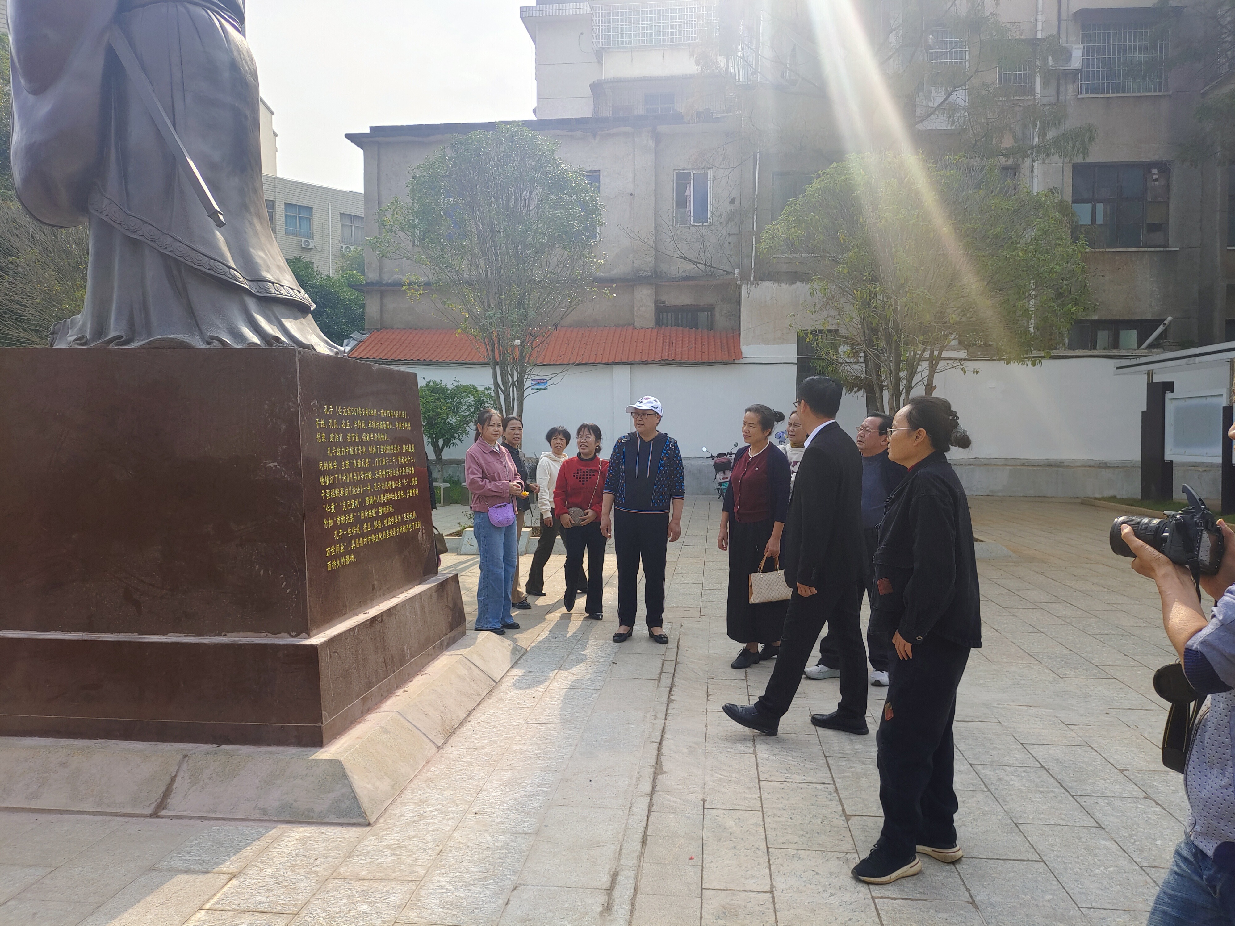 嘉禾五中党委委员、副校长王志亲自带队,陪同退休教职工们漫步校园,开启了一场重温故地、共赏新颜的温馨之旅。今日的嘉禾五中,早已不复老师们记忆中的模样,处处焕发着蓬勃生机与崭新气象。沿着整洁的道路前行,行至校园中心广场,一尊庄严肃穆的孔子雕塑静静矗立,王校长细致地为老师们讲解了孔子雕像的设计深意。