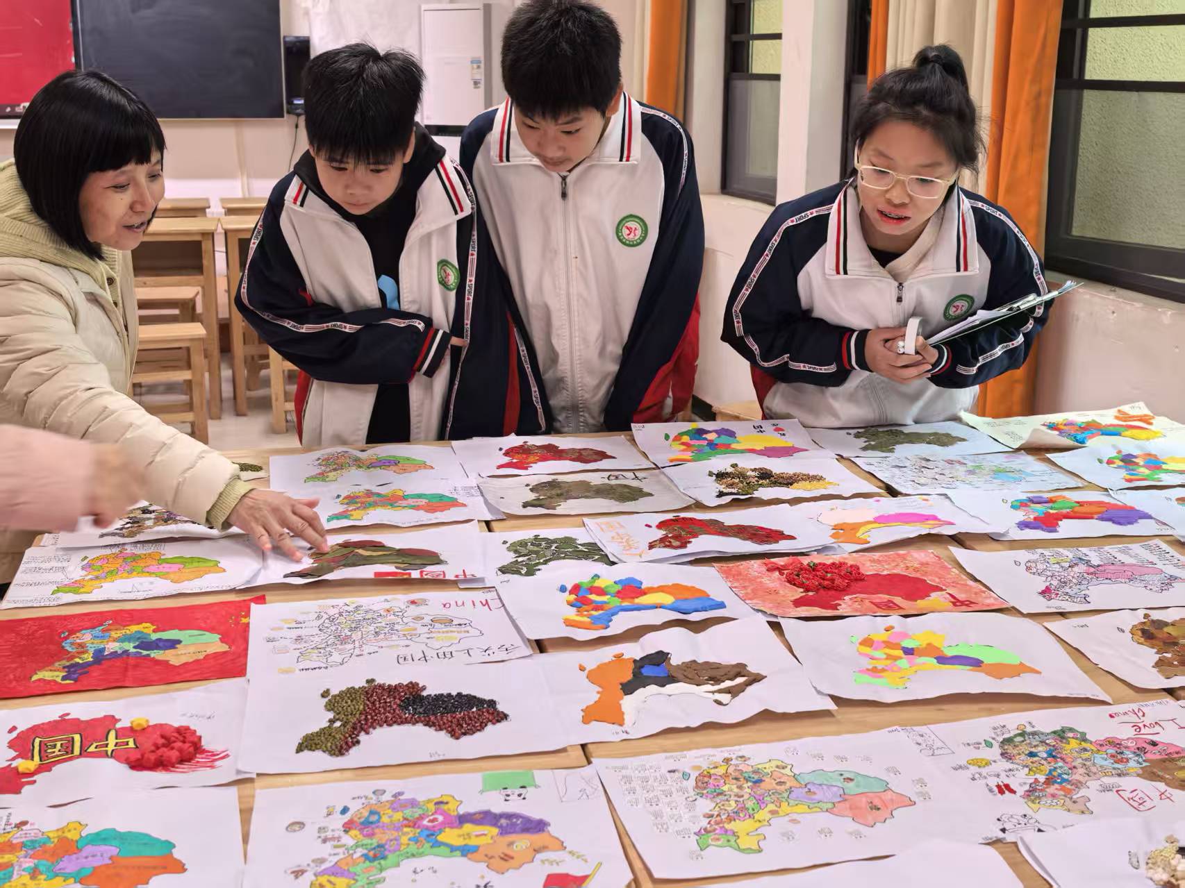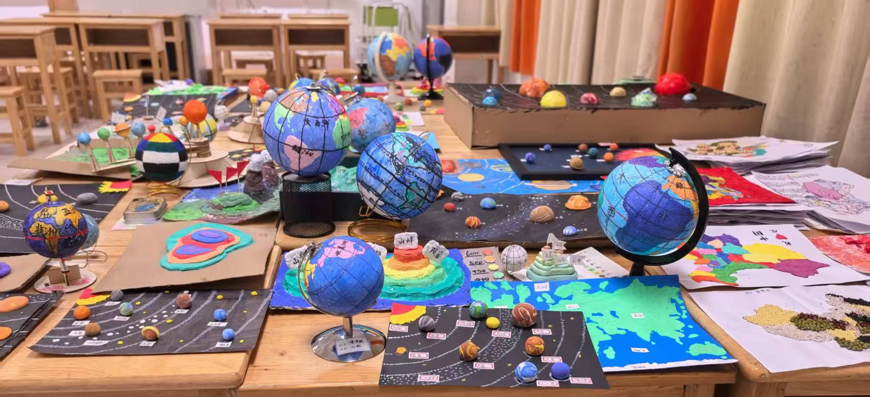 活动现场,各式各样的模型琳琅满目。有同学用红豆、绿豆、小米等谷物拼贴出色彩斑斓的中国地图,形象地展现出我国不同区域的地形特征;有的同学用轻粘土捏制出精致的太阳系模型,八大行星排列有序;还有同学利用硬纸板制作出等高线地形模型,通过不同颜色的填充,清晰地表现出山脊、山谷、陡坡与缓坡;更有同学制作了精美逼真的地球仪,七大洲与四大洋分布清晰,色彩丰富。