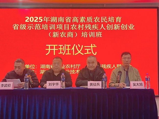 湖南教育新闻网讯(通讯员 陈文彪)11月24日上午,2025年湖南省高素质农民培育省级示范培训班——农村残疾人创新创业(新农商)示范培训班开班仪式在长沙盛聚大酒店三楼盛才厅隆重举行。湖南省农业农村厅事业促进处副处长刘宇华,湖南省残联一级调研员黄征兵,湖南工程职业技术学院党委副书记李武初等领导出席仪式,来自全省各地的农村残疾人创业骨干齐聚长沙,开启为期数天的“赋能充电”学习之旅。湖南工程职业技术学院继续教育学院院长吴大旭主持开班仪式。