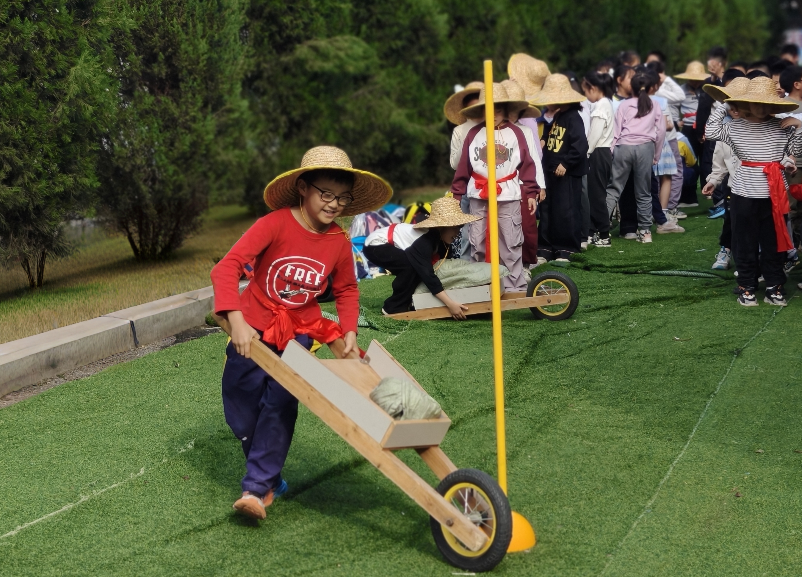 与此同时,学生们的农耕实践活动正如火如荼地展开。手持任务手册的孩子们化身为“小农人”,投入到六大主题闯关任务中。“寻种”环节,三年级同学像寻宝小侦探般手持藏宝图仔细搜寻,四、五年级同学则操作北斗坐标仪精准定位,在探索的乐趣中悄然埋下求知与传承的种子;走进“洞庭湖稻作文化长廊”,从一粒稻谷的春播秋收中,同学们真切体会到了“粒粒皆辛苦”的千钧重量;在最激动人心的“运谷”挑战中,同学们推起沉甸甸的独轮车,亲身体验革命年代物资运输的艰难与伟大,也更深刻地理解了今天的幸福生活来之不易。